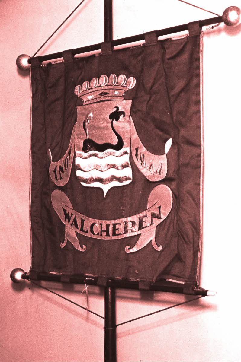 The Standard, to be kept in St. Andrew's Church at Eastney, to be used for ceremonial occasions such as commemoration of the assault on Walcheren, 1 November, 1944. Inscription: Presented by the Queen's Commissioner for Zealand from the people of Walcheren - 'as a tangible gift to those who liberated them from the Germans.'
