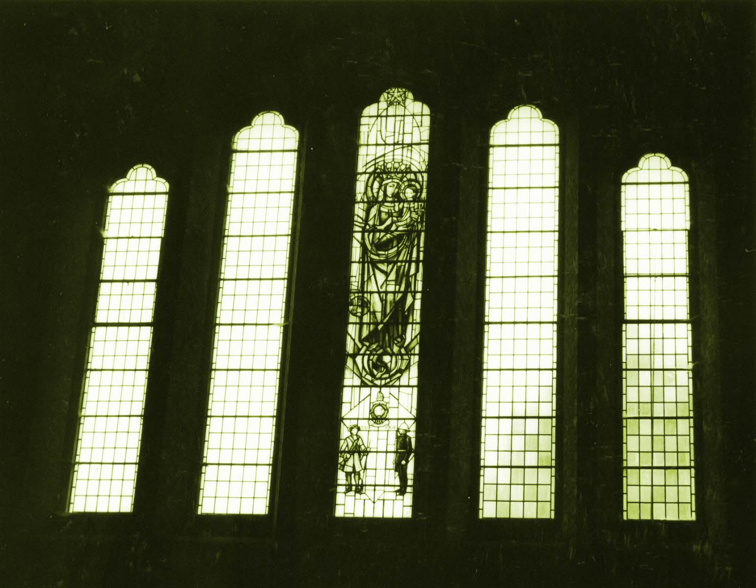 Coloured glass panel given by all ranks who served at the Depot, Royal Marines, in the Tercentenary Year to commemorate the formation of the Admiral's Regiment on 28 October, 1664. dedicated on 2 May 1965.