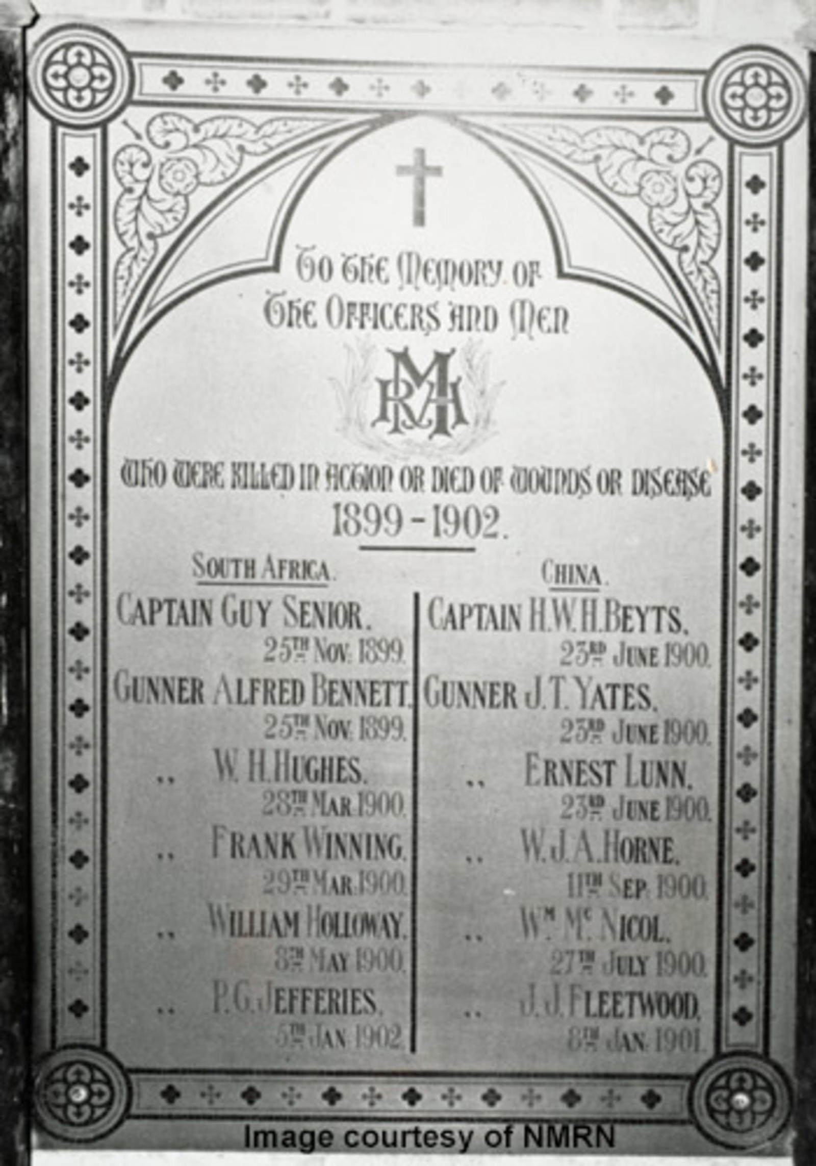 South Africa: Capt Guy Senior, 25 Nov 1899: Gunners; Alfred Bennett, 25 Nov 1899; W H Hughes, 28 Mar 1900; Frank Winning, 29 Mar 1900; William Holloway, 8 May 1900; P G Jefferies, 5 Jan 1902. China: Capt H W H Beyts, 23 June 1900: Gunners: J T Yates, 23 June 1900; Ernest Lunn, 23 June 1900; W J A Horne, 11 Sep 1900; W M McNicoll, 27 Jul 1900; J J Fleetwood, 8 Jan 1901."