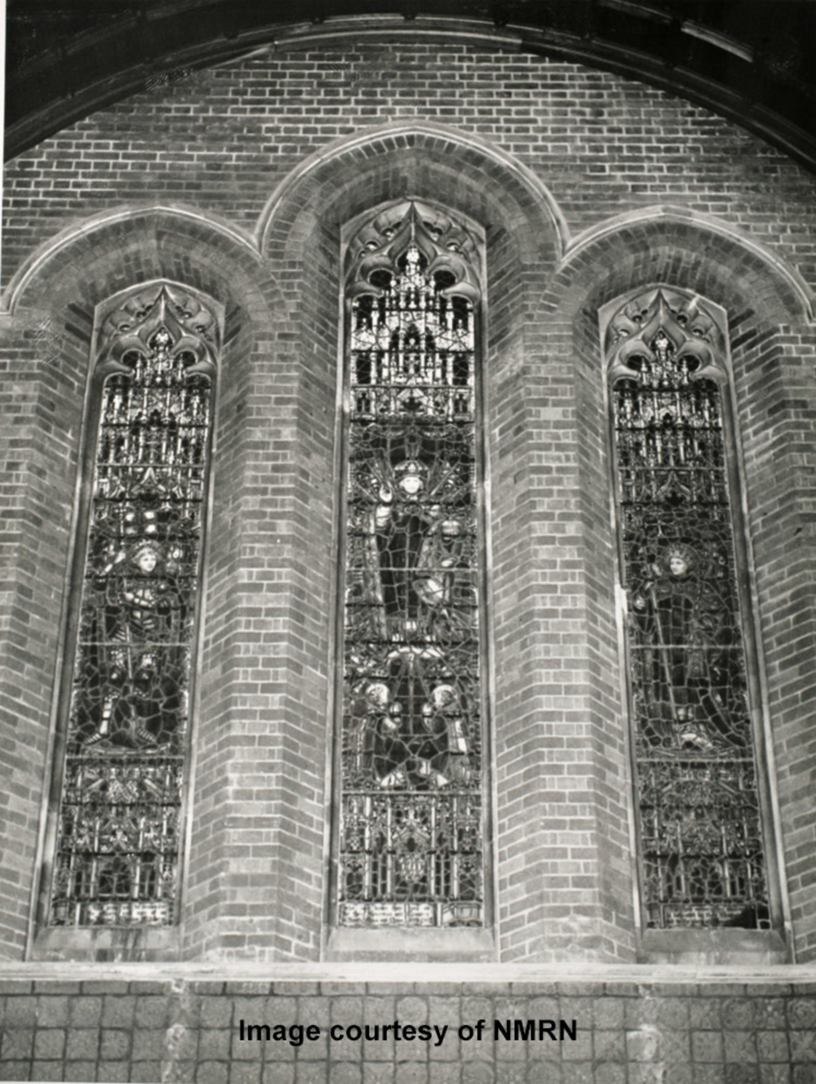 The three windows were installed in St Andrew's Church, Henderson Road. When the building was converted to housing in the 1990s the windows and other immovable decorations were left in place and covered over. It is assumed that these windows still exist behind internal walling.