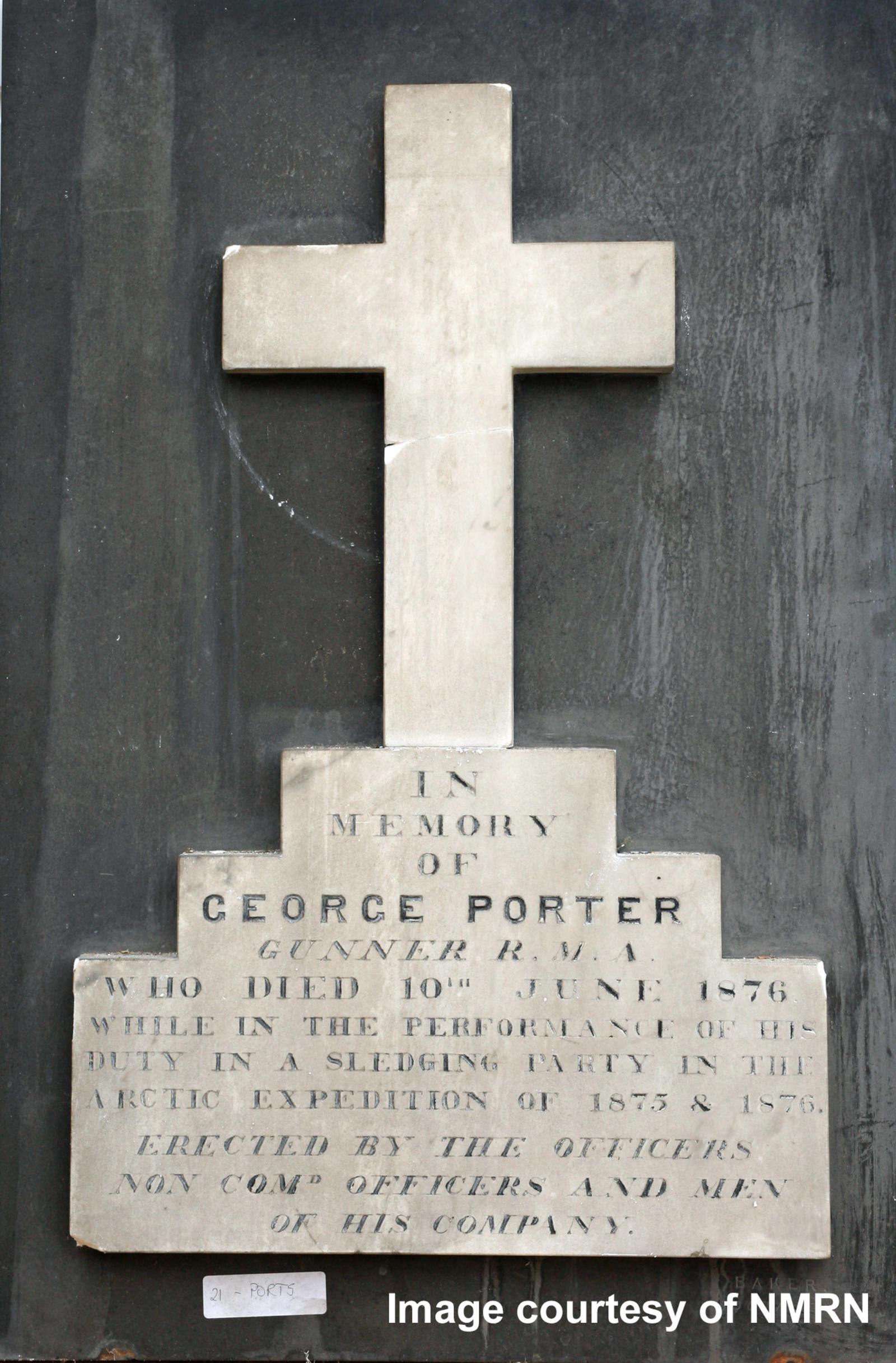 In memory of George Porter Gunner RMA who died 10 June 1876 while in the performance of his duty in a sledging party in the Arctic Expedition of 1875 & 1876. Erected by the officers, Non Com Officers and men of his company.