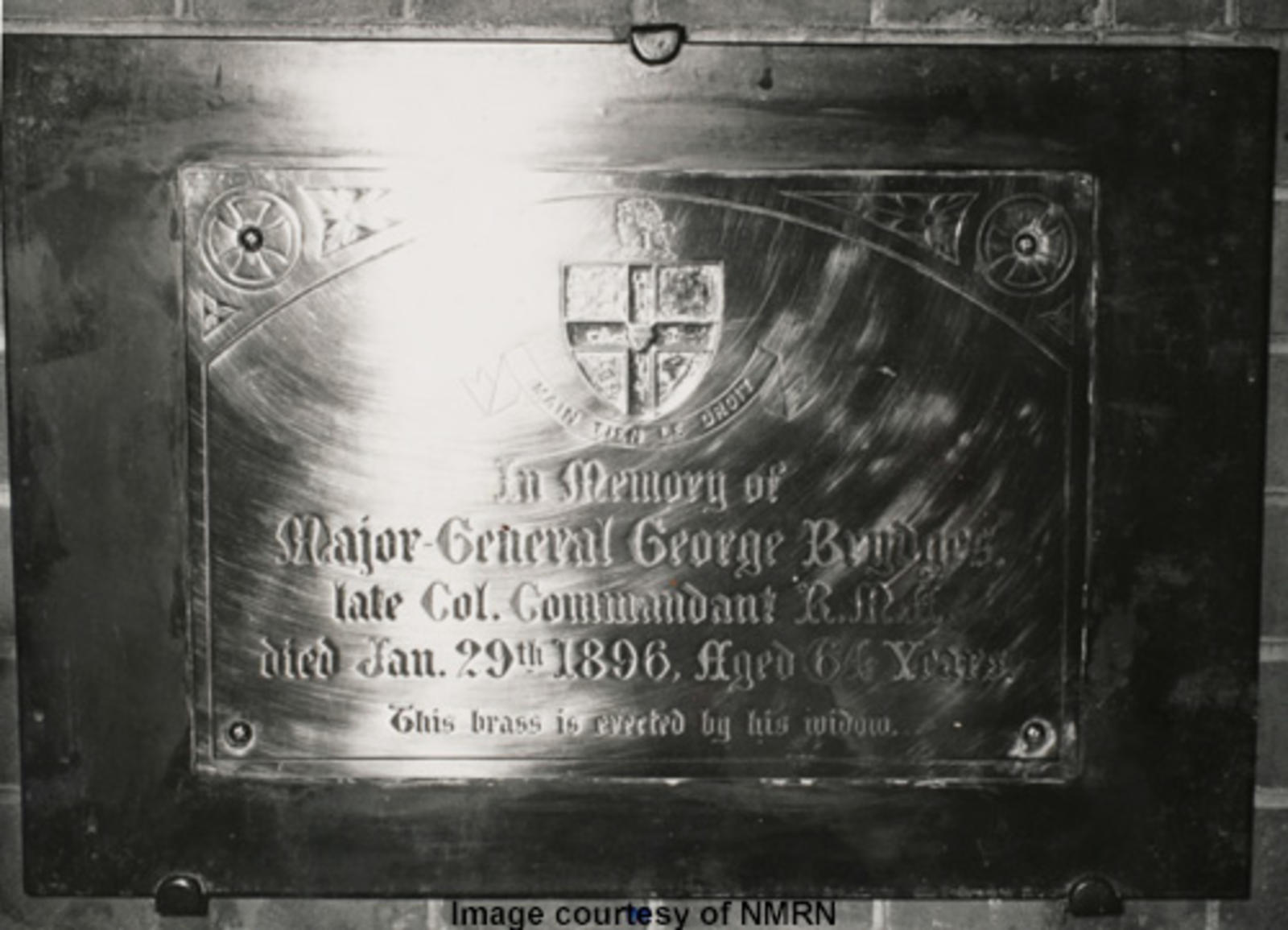 AIn memory of Major General George Brydges late Col Commandant RMA, died Jan 29th 1896, Aged 64 years. This brass is erected by his widow