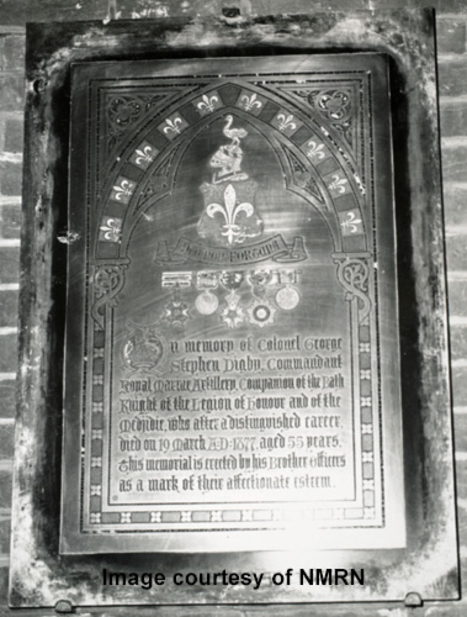 In memory of Colonel George Stephen Digby, Commandant Royal Marine Artillery, Companion of the Bath, Knight of the Legion of Honour and of the Mejidie, who after a distinguished career died on 19 March AD 1877 aged 55 years. This memorial is erected by his brother officers as a mark of their affectionate esteem