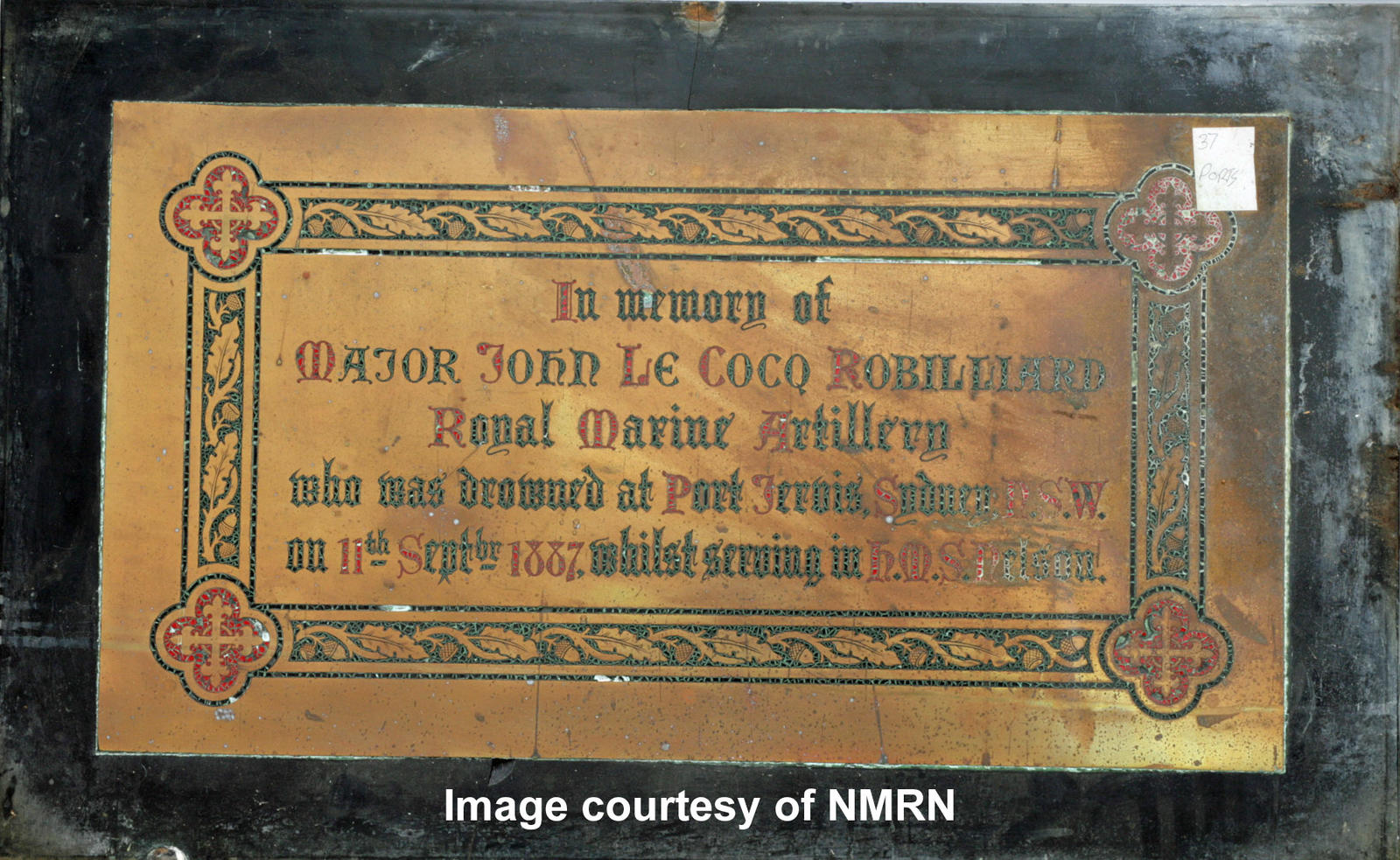 In memory of Major John Le Cocq Robilliard, Royal Marine Artillery, who was drowned at Port Jervis Sydney NSW on 11 Sep 1887 whilst serving in HMS Nelson