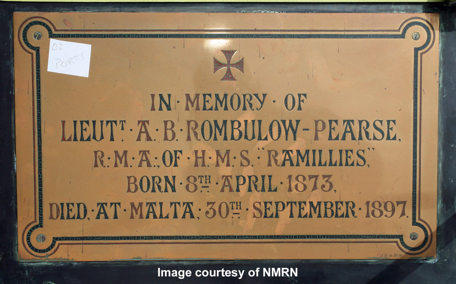 In memory of Lieut A B Rombulow-Pearse, RMA, of HMS Ramillies. Born 8th April 1873. Died at Malta 30th September 1897