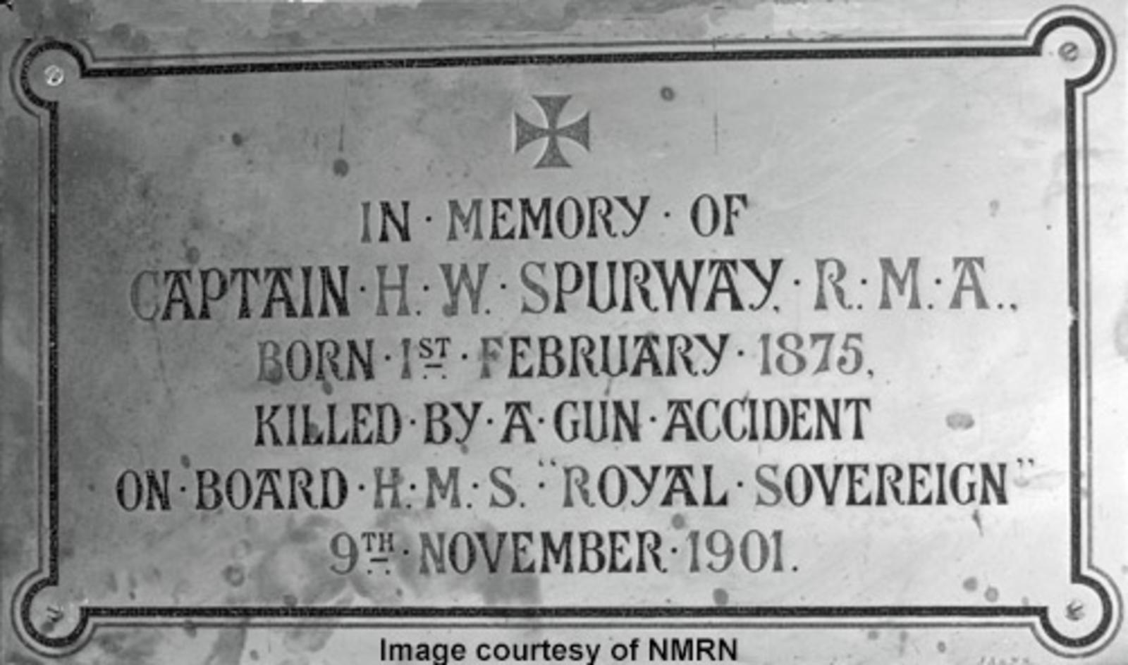 In memory of Captain H W Spurway, RMA. Born 1st February 1875. Killed by a gun accident on board HMS Royal Sovereign, 9th November 1901.