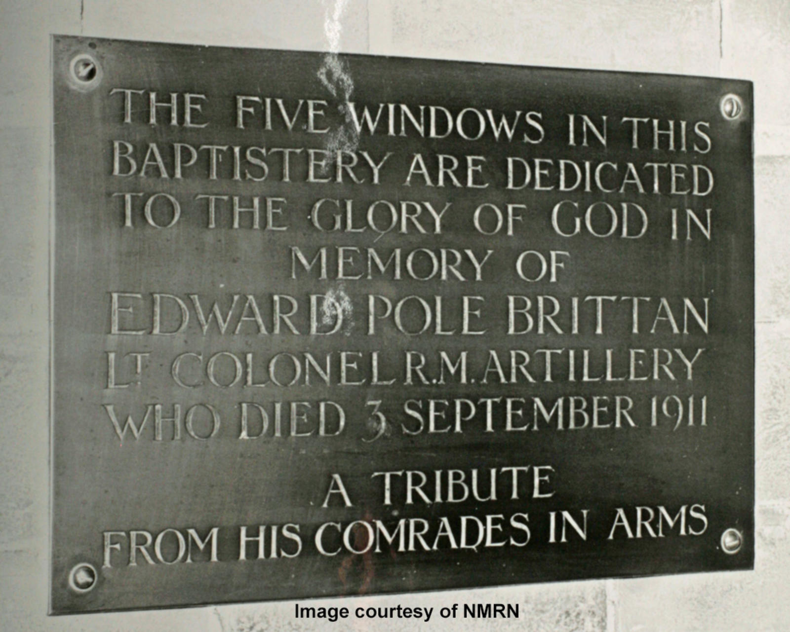 The five windows in this Baptistry are dedicated to the Glory of God in memory of, Edward Pole Brittan, Lt Colonel RM Artillery who died 3 September 1911. A tribute fro his comrades in arms