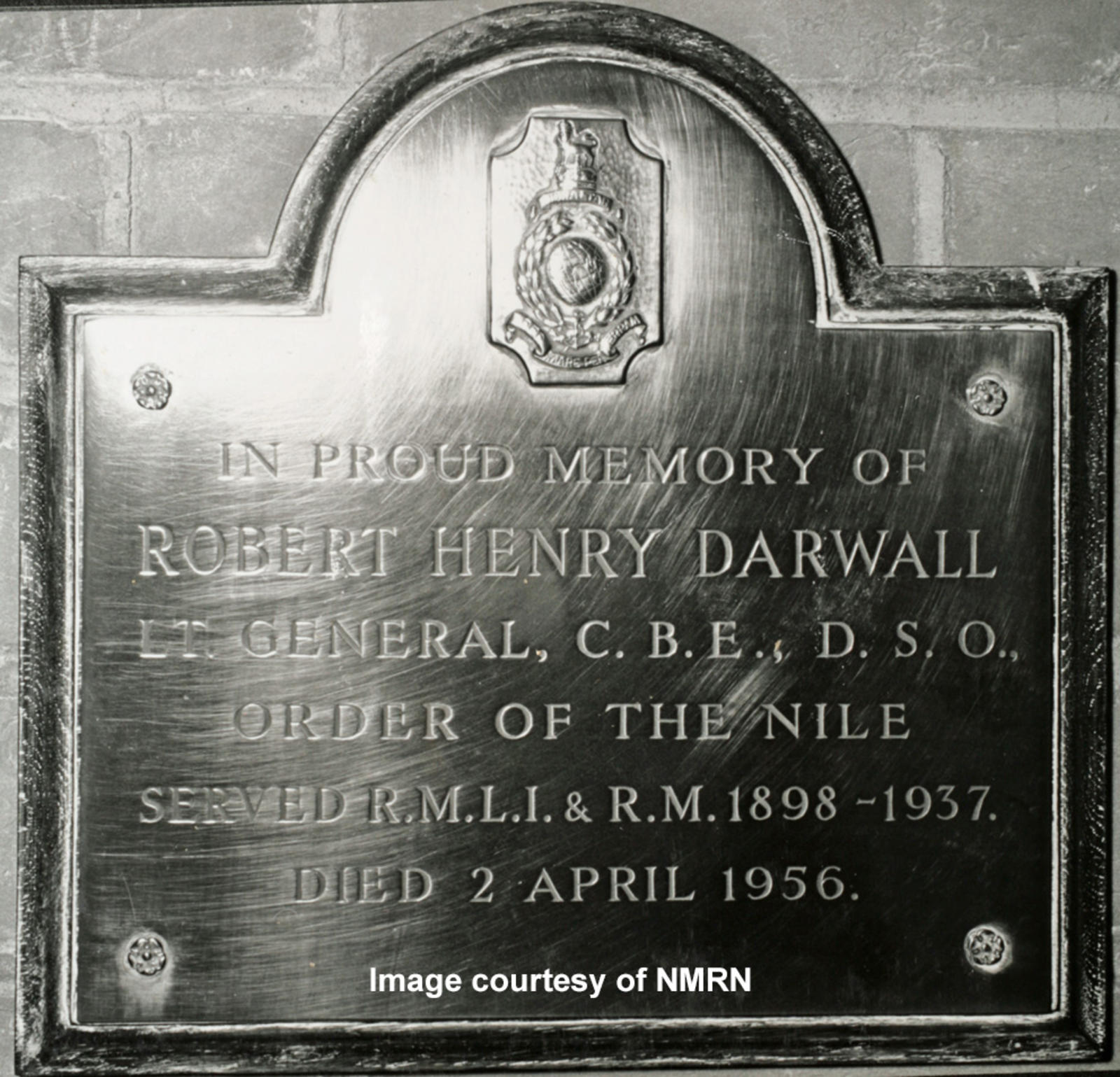 In proud memory of Robert Henry Darwall, Lt General, CBE, DSO, Order of the Nile. Served RMLI & RM 1898-1937. Died 2 April 1956