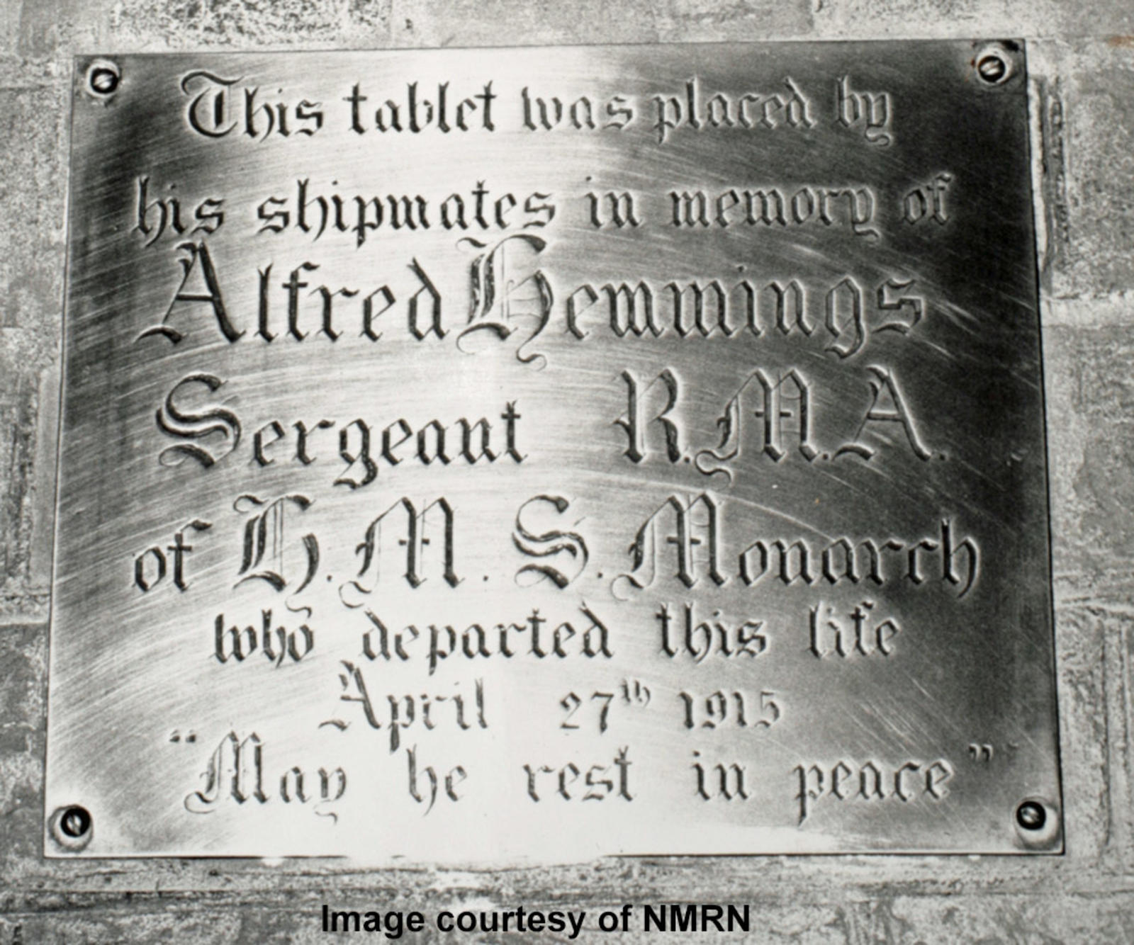 This tablet was placed by his shipmates in memory of Alfred Hemmings Sergeant RMA of HMS Monarch who departed this life April 27th 1915 "May he rest in peace"