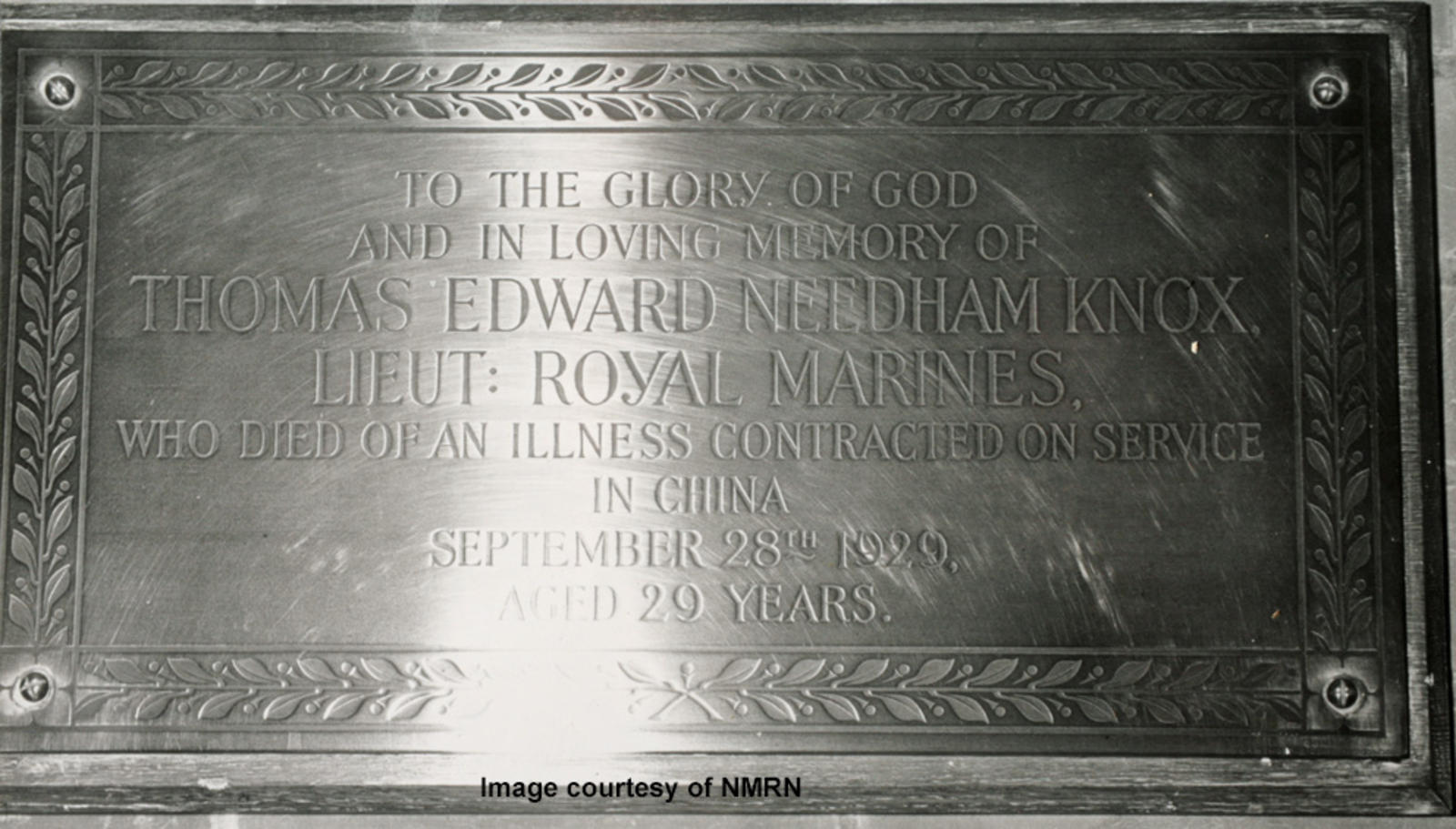 To the Glory of God and in loving memory of Thomas Edward Needham Knox, Lieut Royal Marines, who died of an illness contracted on service in China, September 28th 1929, aged 29 years