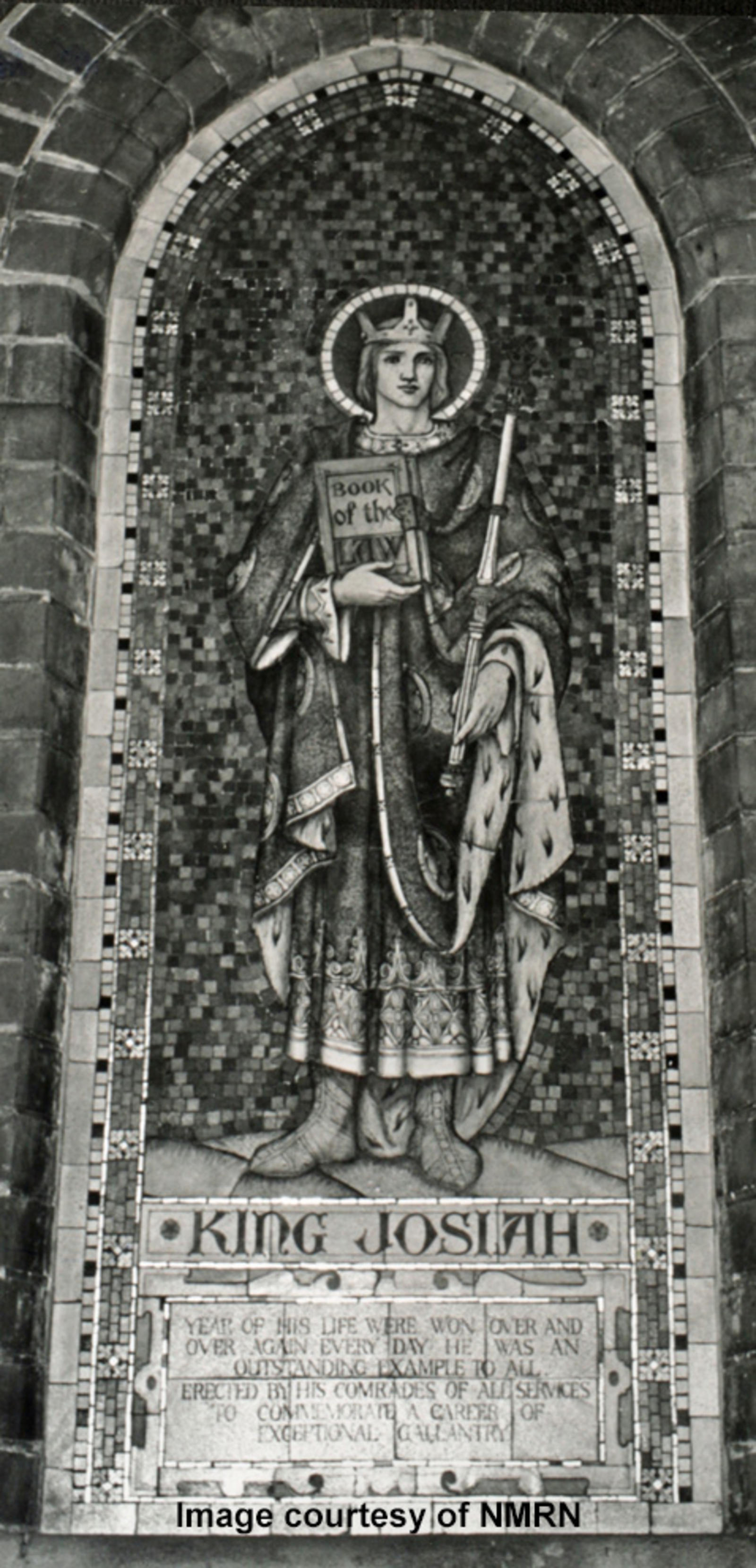 These two mosaics were part of the decoration in St Andrew's Church, Eastney. The church was converted to housing in the 1990s and these and most other immovable decorations were left in place and covered over. It is assumed that these mosaics still exist behind internal walling.