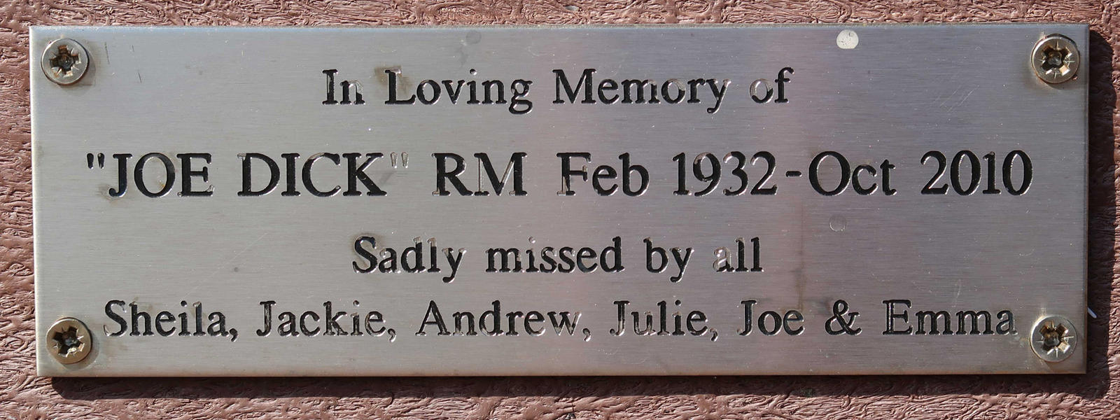 In Loving memory of "Joe Dick" RM Feb 1932-Oct 2010, Sadly missed by all, Sheila, Jackie, Andrew, Julie, Joe, & Emma