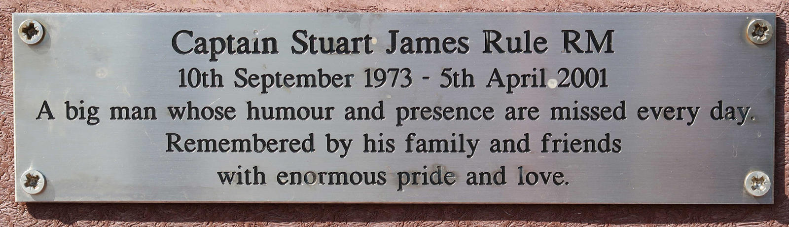 Captain Stuart James Rule RM, 10th September 1973 - 5th April 2001, A big man whose humour and presence are missed every day. Remembered by his family and friends with enormous pride and love.