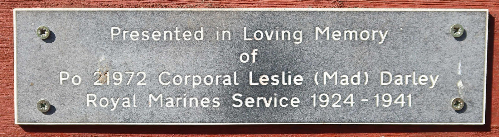 Presented in Loving Memory of Po 21972 Corporal Leslie (Mad) Darley, Royal Marines Service 1924 - 1941