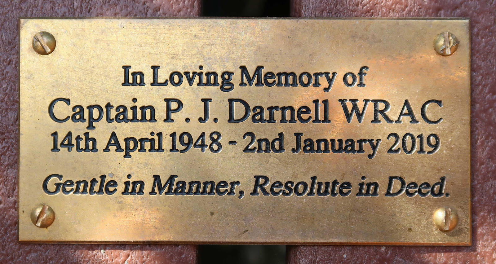 In Loving Memory of Captain P J Darnell WRAC, 14th April 1948 - 2nd January 2019, Gentle in Manner, Resolute in Deed