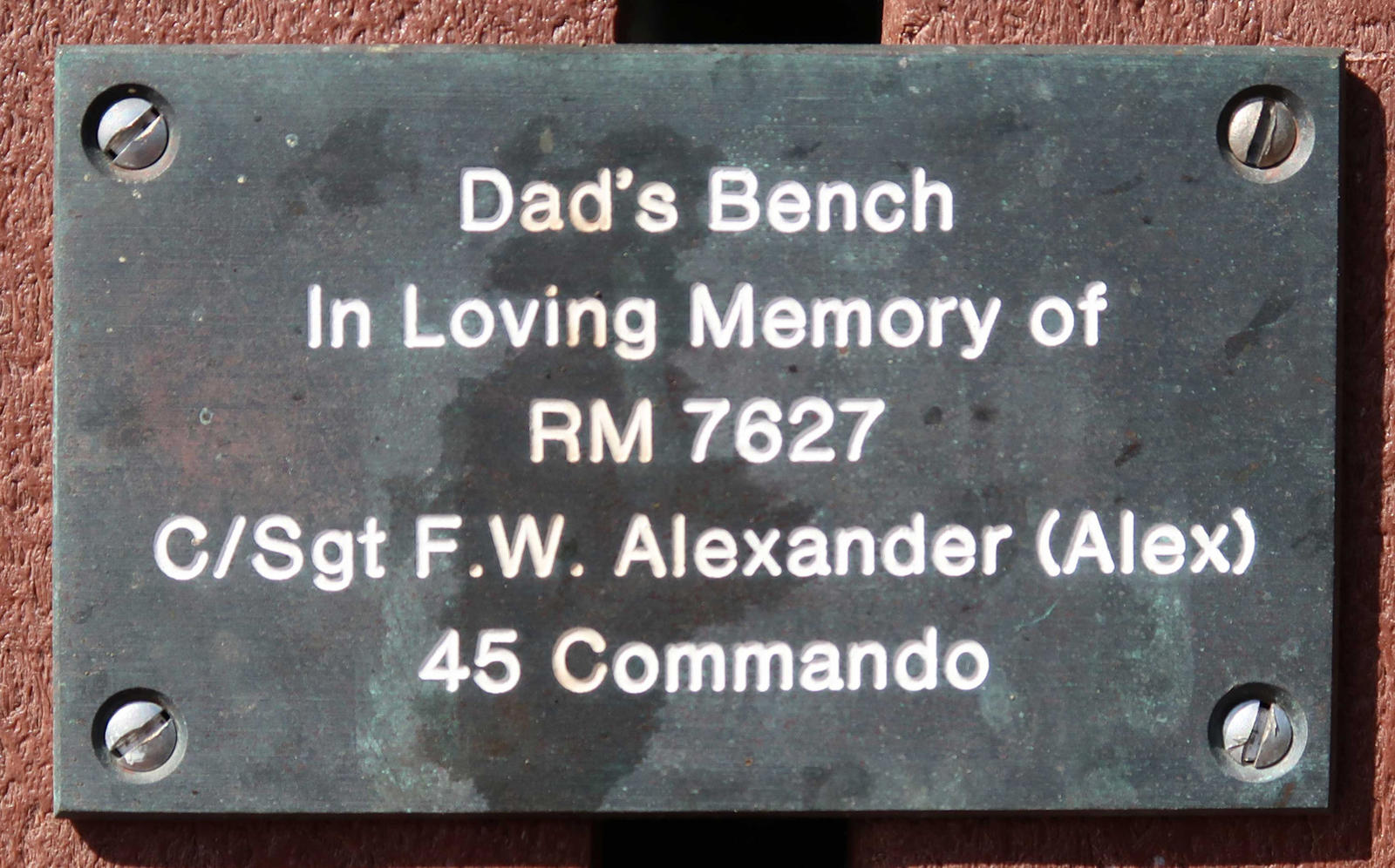 Dad's Bench, In Loving Memory of RM 7627 C/Sgt F W Alexander (Alex) 45 Commando
