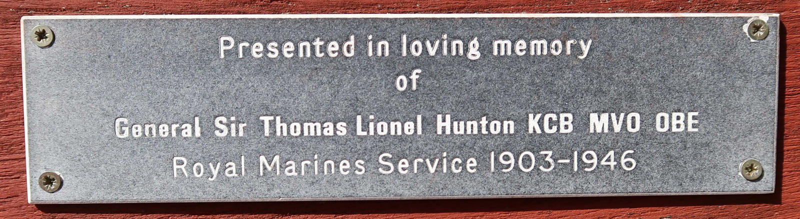 Presented in loving memory of General Sir Thomas Lionel Hunton KCB MVO OBE, Royal Marines Service 1903-1946