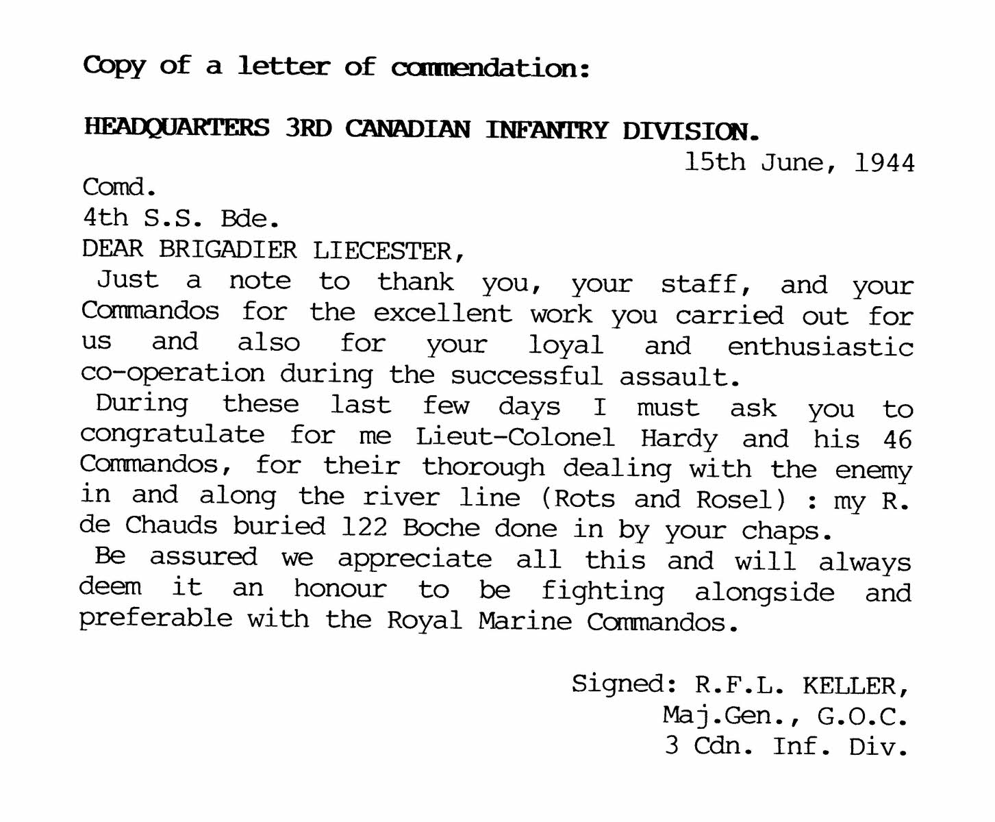 Letter of commendation from Maj. General R. F. L. Keller, G.O.C. 3 Canadian Infantry Division, 15 June, 1944
