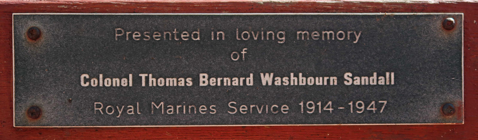 Presented in loving memory of Colonel Thomas Bernard Washbourn Sandall, Royal Marines Service 1914 - 1947
