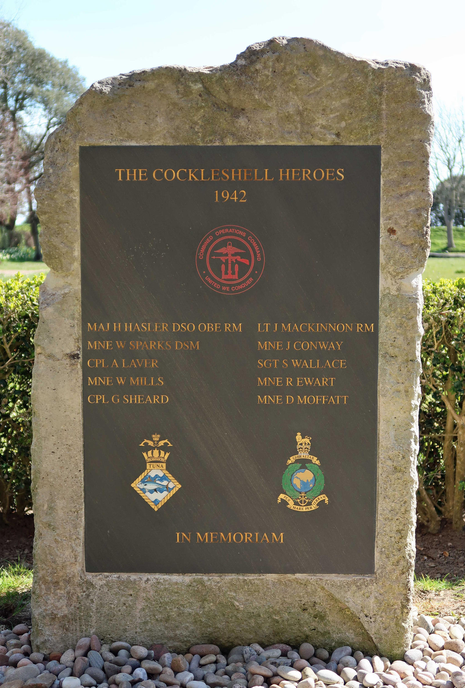The Cockleshell Heroes - 1942. Maj H Hasler OBE DSO RM; Mne W Sparks DSM; Cpl A Laver; Mne W Mills; Cpl G Sheard; Lt J Mackinnon RM; Mne J Conway; Sgt S Wallace; Mne R Ewart; Mne D Moffat. In Memoriam