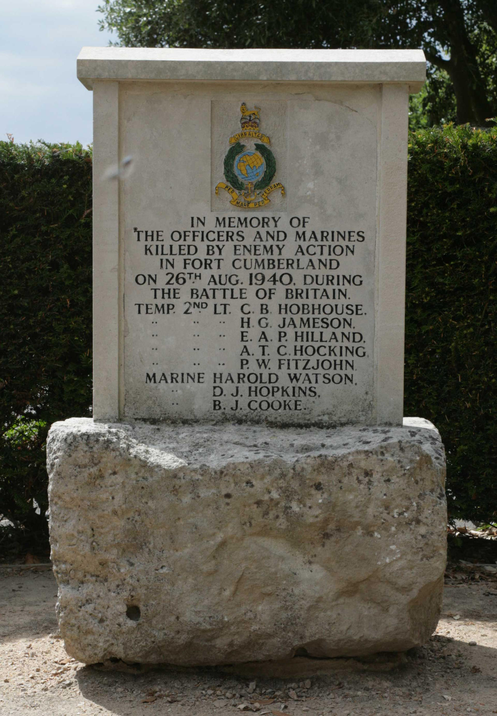 In memory of the Officers and Marines killed by enemy action in Fort Cumberland on 26th August 1940 during the Battle of Britain. Temp 2nd Lts C B Hobhouse; H G Jameson; E A P Hilland; A T C Hocking; P W Fitzjohn; Marines Harold Watson; D J Hopkins; B J Cooke.