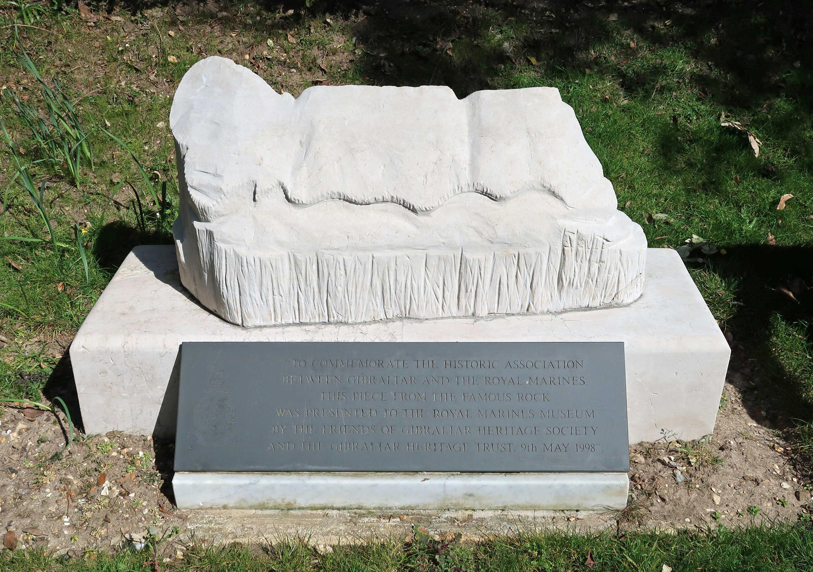 To commemorate the historic association between Gibraltar and the Royal Marines. This piece from the famous rock was presented to the Royal Marines Museum by the Friends of Gibraltar heritage Society and the Gibraltar Heritage Trust, 9th May 1998