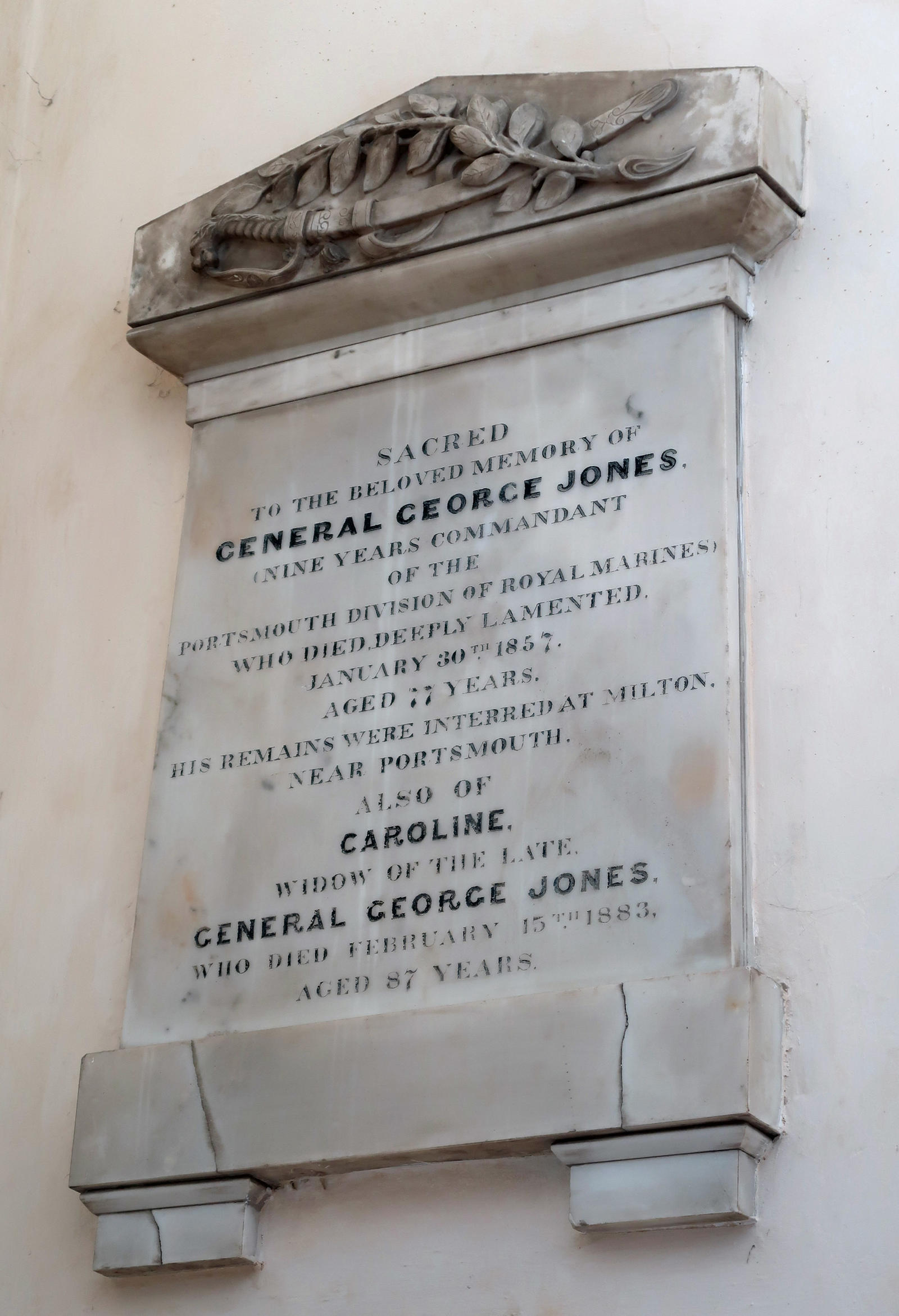 Sacred to the beloved memory of General George Jones nine years Commandant of the Portsmouth Division of Royal Marines who died deeply lamented, January 30th 1857, aged 77 years. His remains are interred at Milton near Portsmouth, also of Caroline widow of the late General George Jones, who died February 15th 1883, aged 87 years.