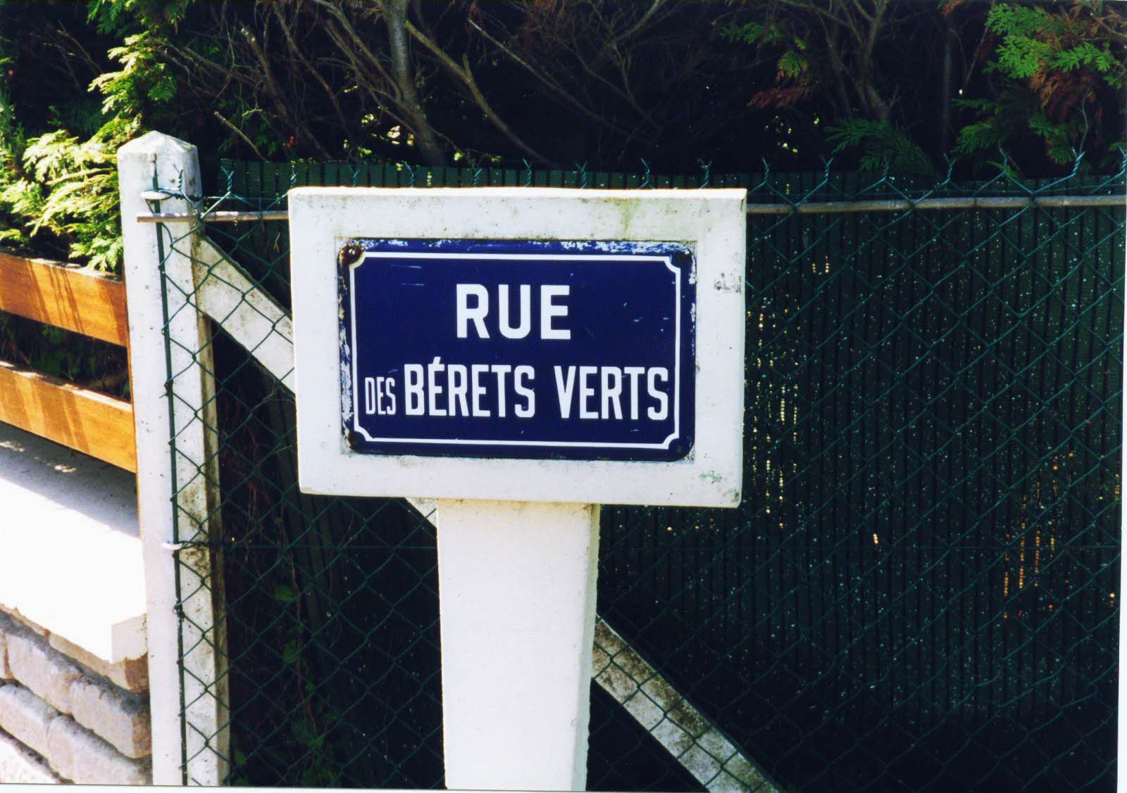 Street nameplate for Rue des Berets Verts, dedicated to 41 and 48Commando's RM who were both involved in the capture of an important radar station at Douvres La Deliverande, Normandy, France Inscription: Rue des Berets Verts