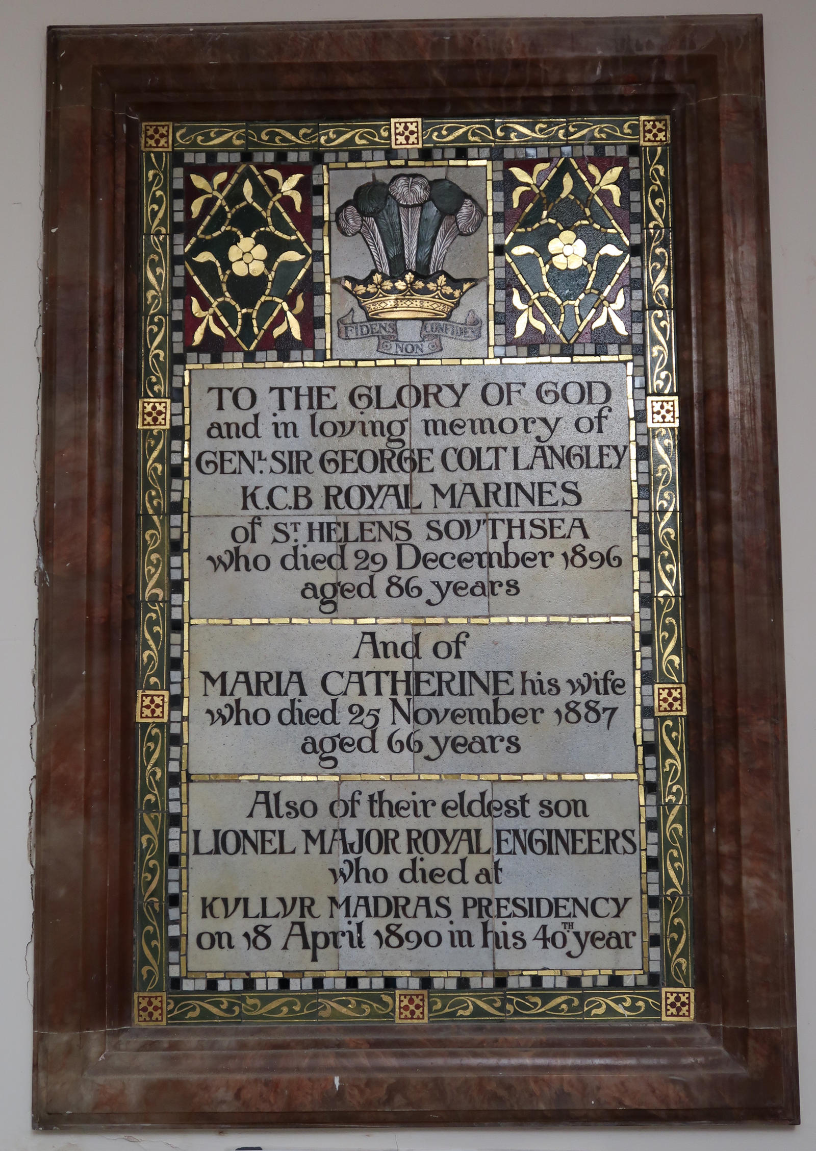To the Glory of God and in loving memory of Gen Sir George Colt Langley KCB Royal Marines of St Helens, Southsea who died 29 December 1896, aged 86 years. And of Maria Catherine his wife who died 25 November 1887 aged 66 years. Also their eldest son Lionel, Major Royal Engineers who died at Kullur Madras Presidency on 18 April 1890 in his 40th year.