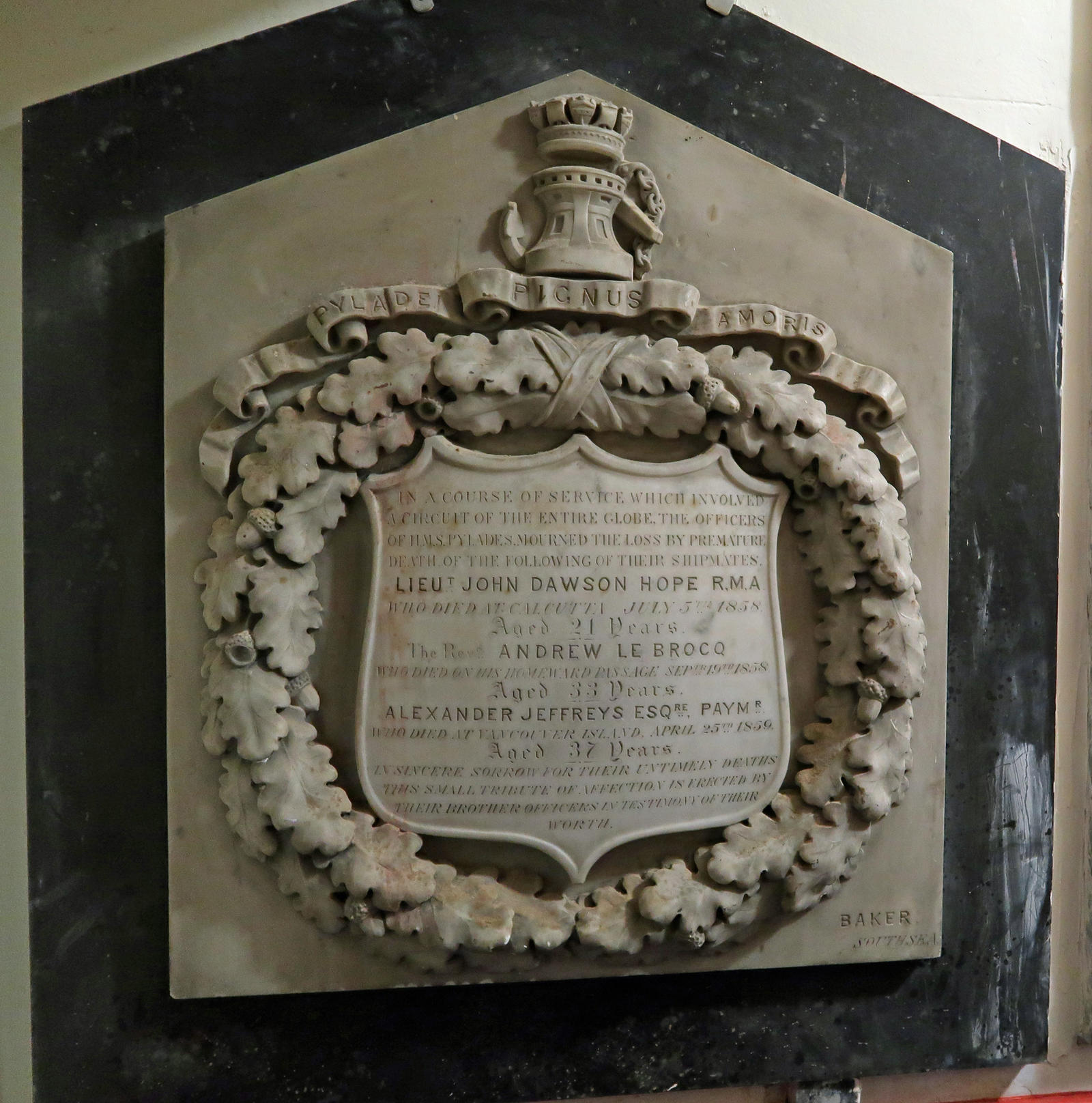 In a course of service which involved a circuit of the entire globe, the officers of HMS Pylades, mourned the loss by premature death of the following of their shipmates: Lieut John Dawson Hope RMA who died at Calcutta July 5th 1858, aged 21 years. The Revd Andrew le Brocq who died on his homeward passage Sept 19th 1858, aged 33 years. Alexander Jeffreys Esq Pay Mr who died at Vancouver Island April 25th 1859.