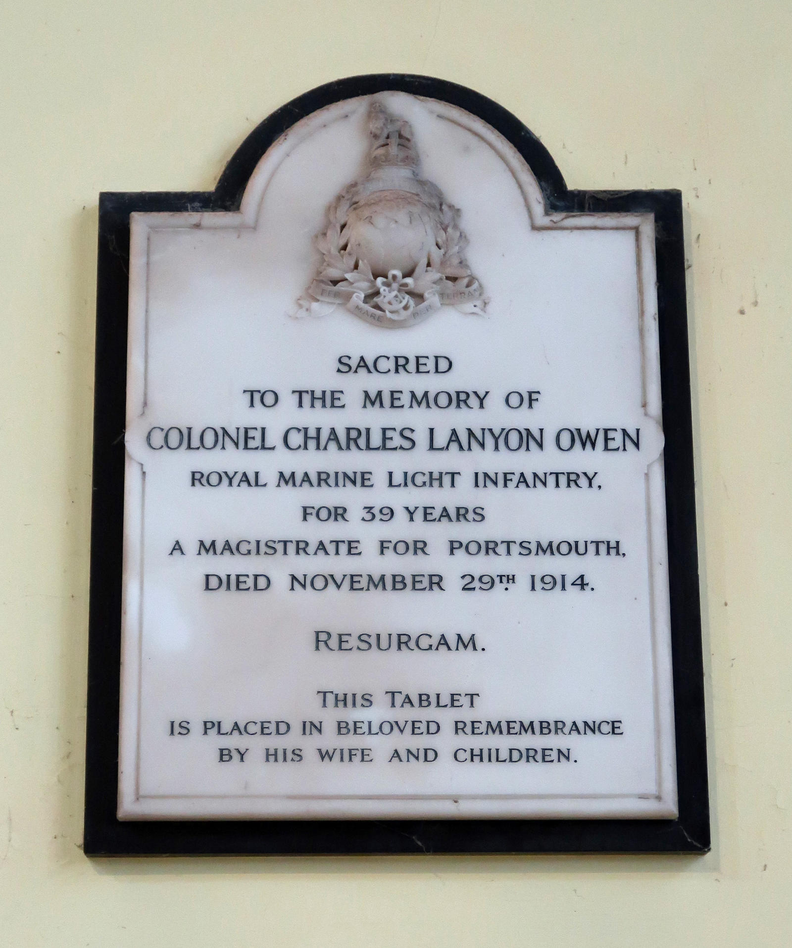 Sacred to the memory of Colonel Charles Lanyon Owen Royal Marine Light Infantry, for 39 years. A Magistrate for Portsmouth, died November 29th 1914. Resurgam. This tablet is placed in loving remembrance by his wife and children.