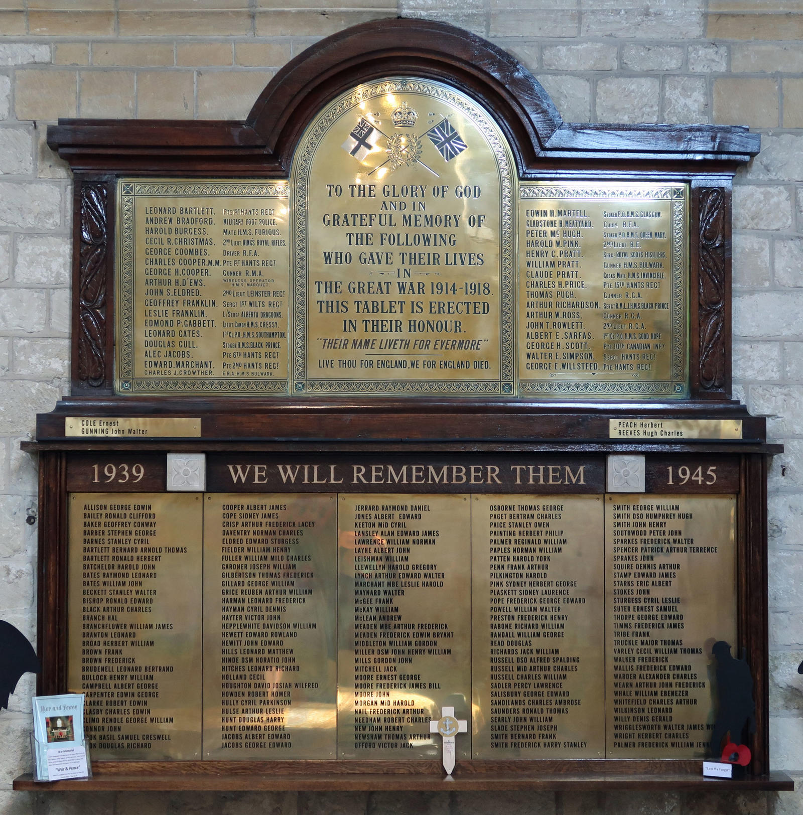 To the Glory of God and in grateful memory of the following who gave their lives in the Great War 1914-1918. This tablet is erected in their honour, "Their name liveth for evermore". Live thou for England, we for England died. Includes: WW1; George H Cooper, Gunner, RMA. WW2: George Edward Allison; Arthur Charles Black; William James Branchflower; Frederick Brown; Henry William Bullock; Basil Samuel Creswell Cook; Reginald William Palmer; Harold York Patten; Frederick Henry Preston; William Ebenezer Whale.