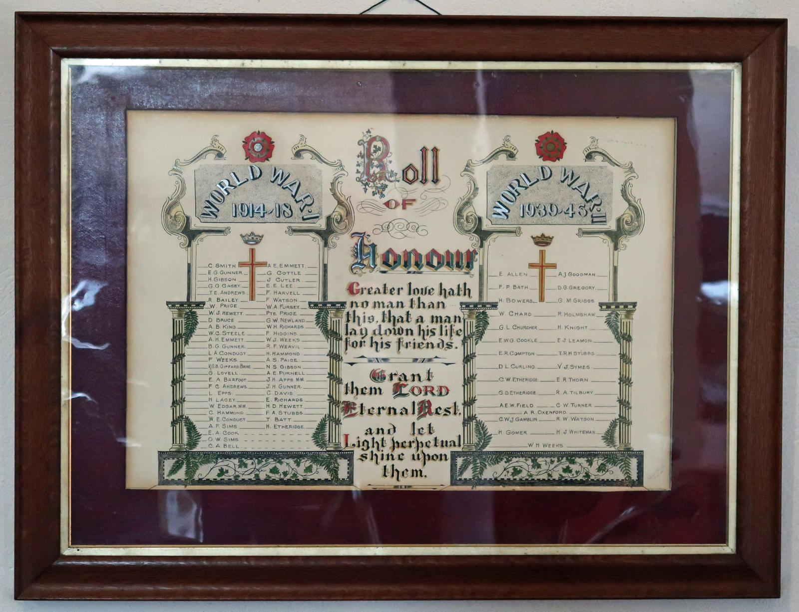 Includes: WW1: F C Andrews; G Lovell; E A Barfoot. WW2: A E W Field; H Gomer