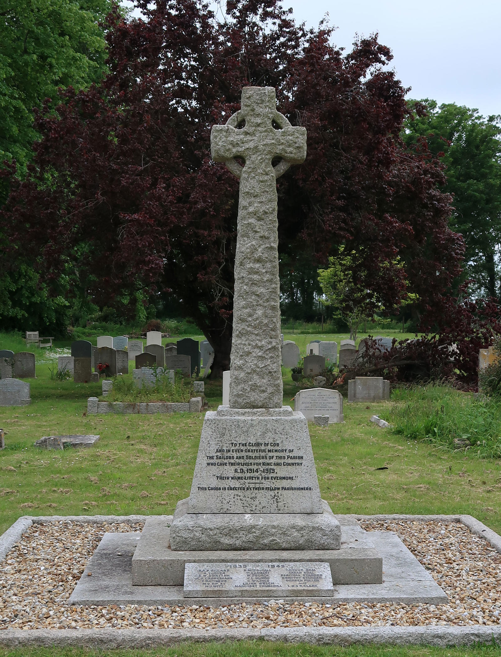 WW1: To the Glory of God and in ever grateful memory of the sailors and soldiers of this parish who gave their lives for King and Country, AD 1914-1919, "Their name liveth for evermore". This cross is erected by their fellow parishioners. WW2: 1939-1945. Includes WW1: Caplin, RMLI; Jones JS, RMLI; Lintorn, RMA; WW2: Hillard, Lt; Munro Capt;