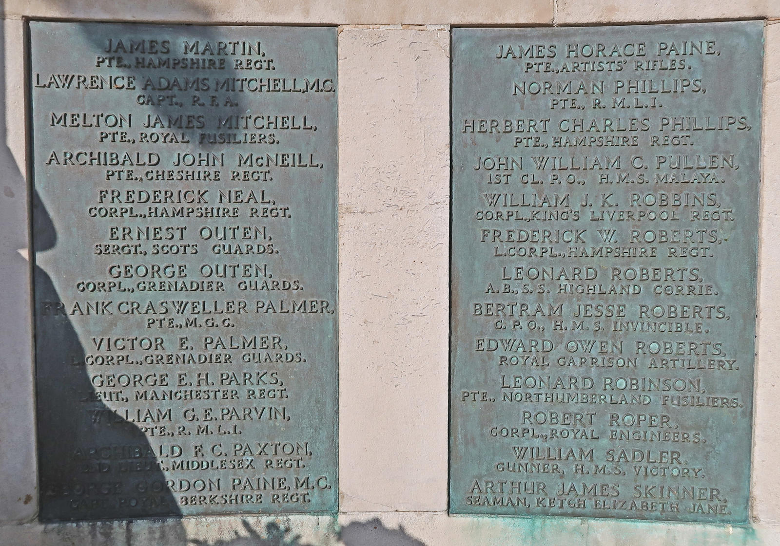 Pte William George Parvin, RMLI, PLY/1718(S), 2nd RM Bn, RM Div, died 28 Apr 1917, France; Pte Norman Phillips, RMLI, PO/18234, Portsmouth Btn, RN Div, died 12 Dec 1915, Gallipoli