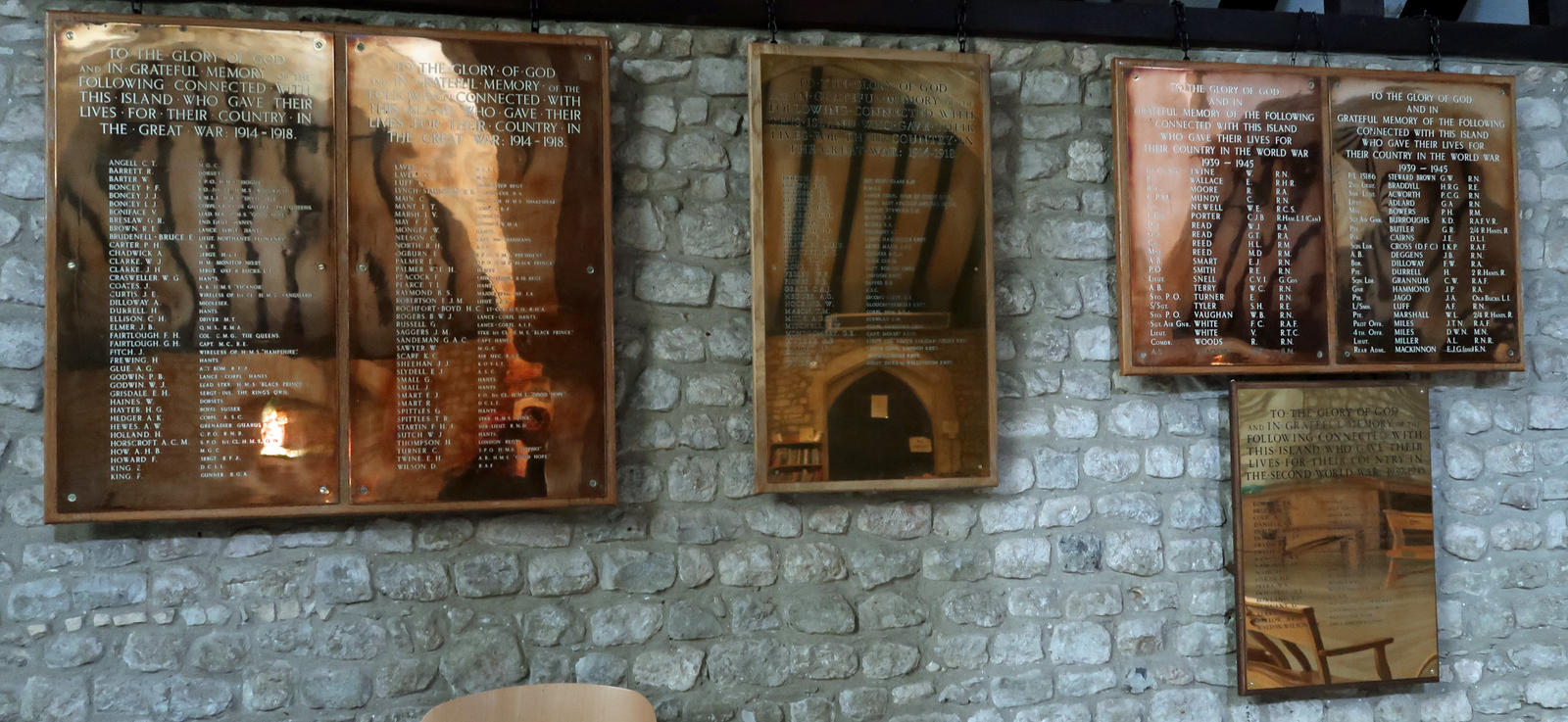 Includes: WW1: Boncey, J J, RMLI, HMS Invincible; Elmer, J B, QMS, RMA; May, F J, Gunner, RMA. WW2: Bowers, P H, Mne; Reed, H L, Cpl; Reed, M D, Mne.