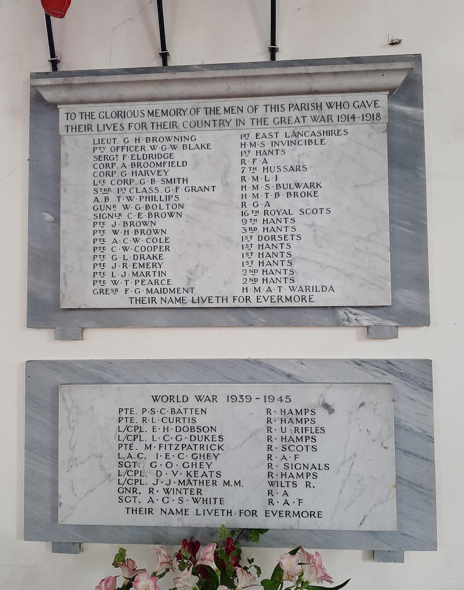 To the Glorious Memory of the men of this parish who gave their lives for their Country in the Great War 1914-1918. Their name liveth for evermore. Includes: Lce Corp G B Smith, RMLI