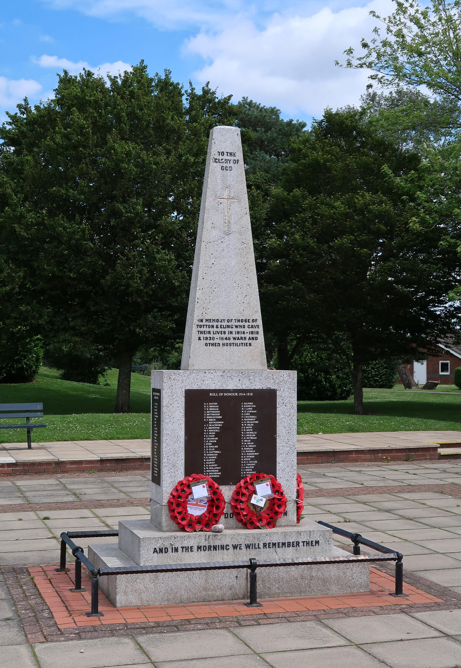 To The Glory of God - In memory of those of Totton & Eling who gave their lives in 1914-1918 & 1939-1945 wars and other hostilities. Includes: WW1: F G Harris. WW2: G Allot; M D Mills; S L Pragnell.