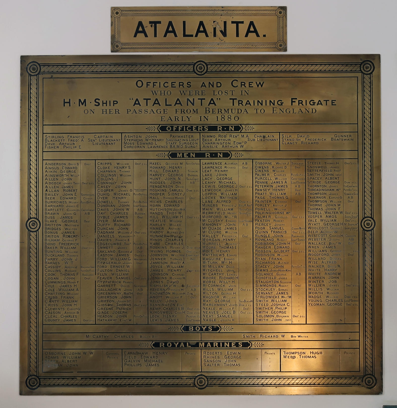 Officers and Crew who were lost in H M Ship "Atalanta" Training Frigate on her passage from Bermuda to England early in 1880. Includes: Osborne, John W W, Cpl; Adams, William, Pte; Berry, Albert, Pte; Earnshaw, Henry, Pte; Field, Edward, Pte; Galvin, Michael, Pte; Roberts, Edwin, Pte; Rhines, George, Pte; Sanson, John, Pte; Salter, Thomas, Pte; Thompson, Hugh, Pte; Webb, Thomas, Pte.