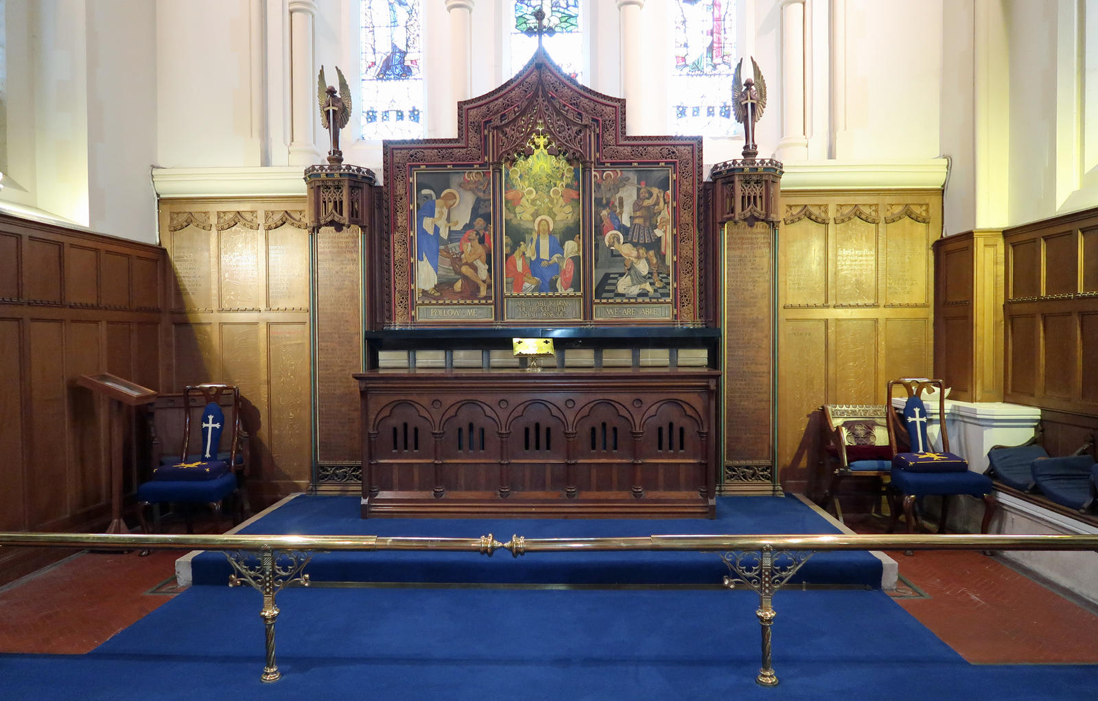 Wooden panels for WW1 &WW2 are either side of the altar. Includes: WW1: W Bailey, Gunner RMA; Denyer J, Pte, RMLI; Rubick, A, Gunlayer, RMA; Sharp, A, Gunner, RMA. WW2: F W Home