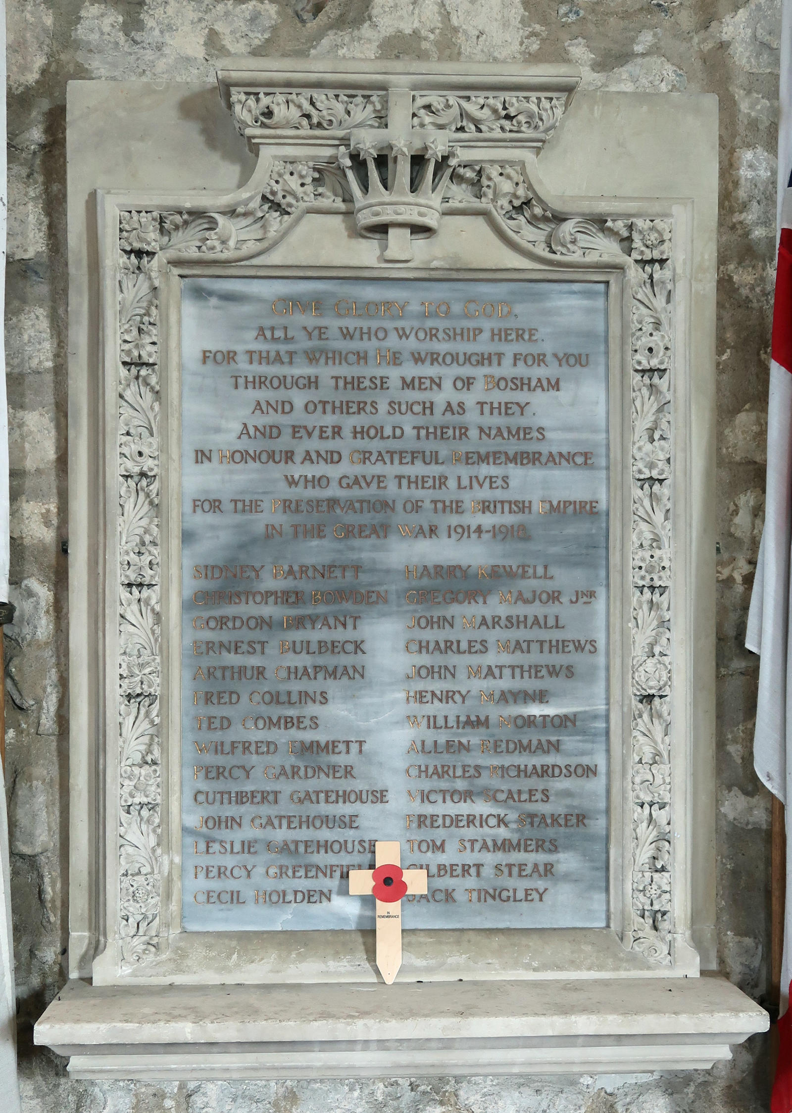 Give Glory to God, all ye who worship here. For that which He wrought for you through these men of Bosham and others such as they and ever hold their names in honour and grateful remembrance whogave their lives for the preservation of the British Empire in the Great War, 1914-1918. Includes: WW1: Percy Gardner