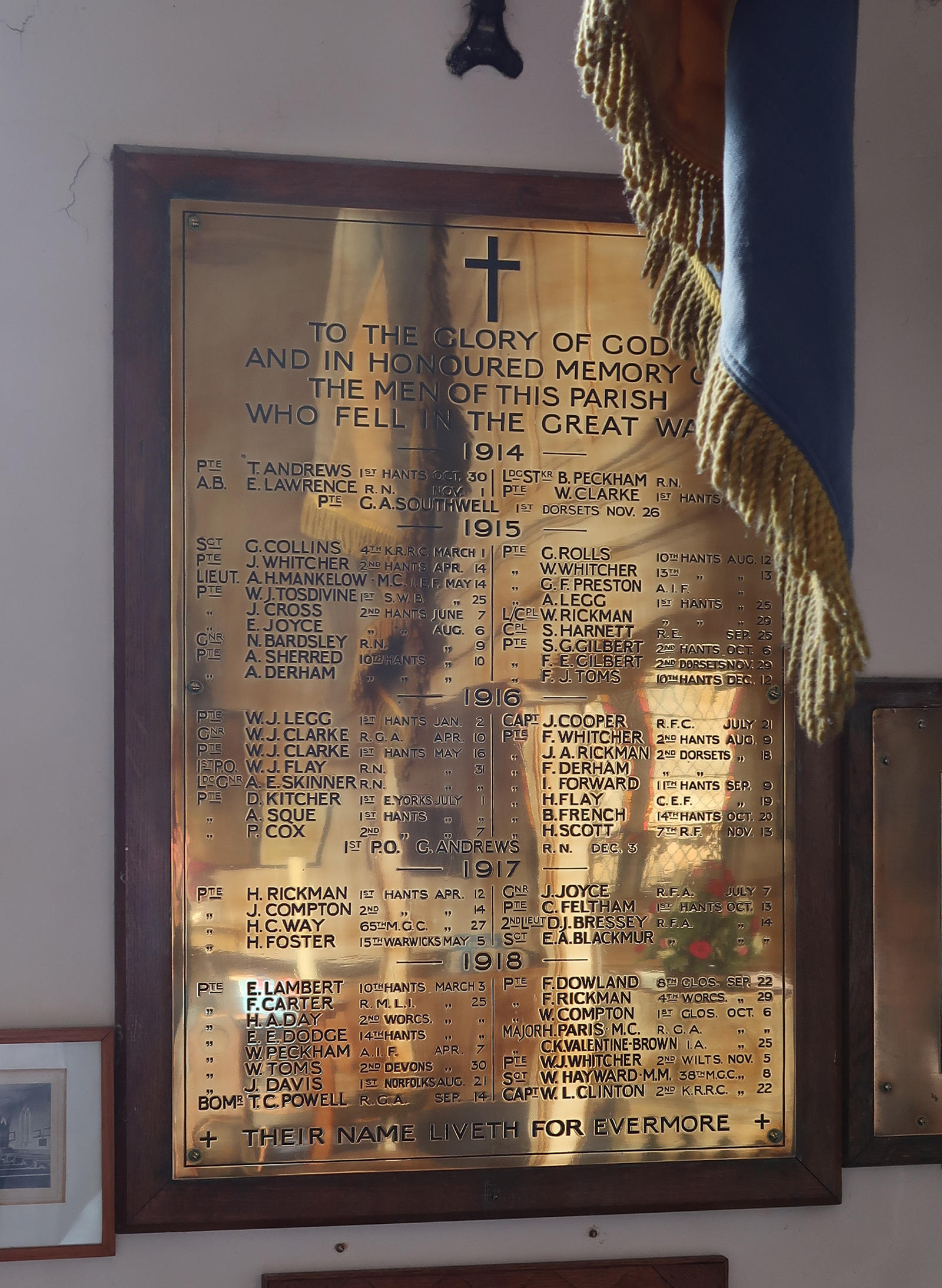 To the Glory of God and in honoured memory of the men of this parish who fell in the Great War. Includes: Pte F Carter, RMLI