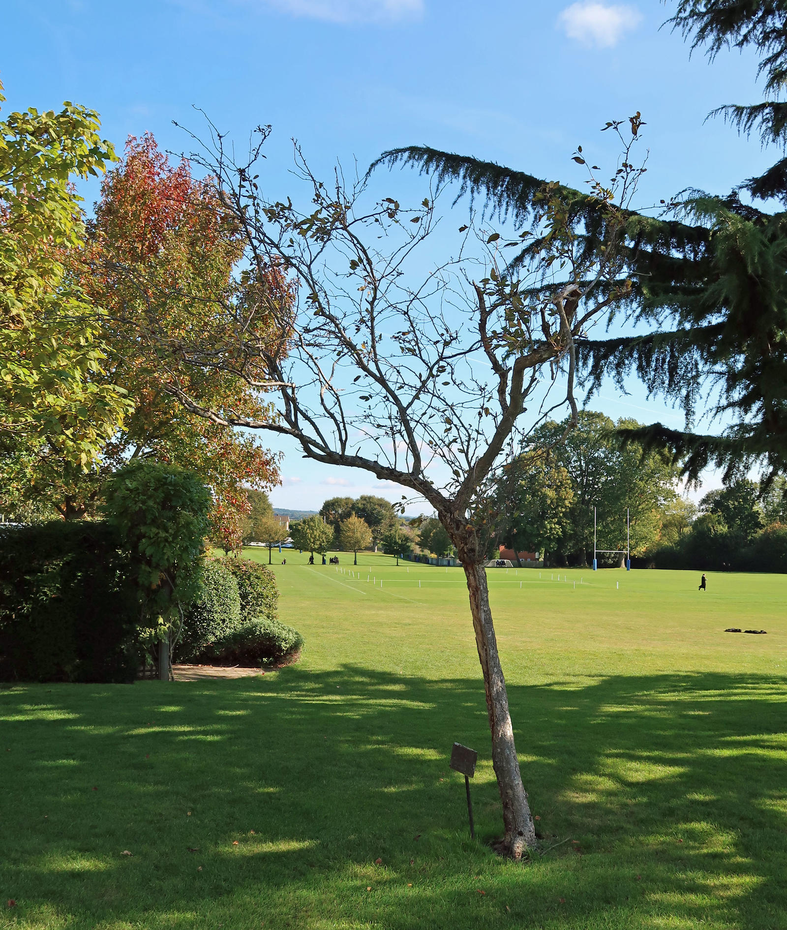 Commemorative tree with plaque. Mne Grahame Dennis Cox. Born 20 Feb 1954. 1965-1970 are his years at the school