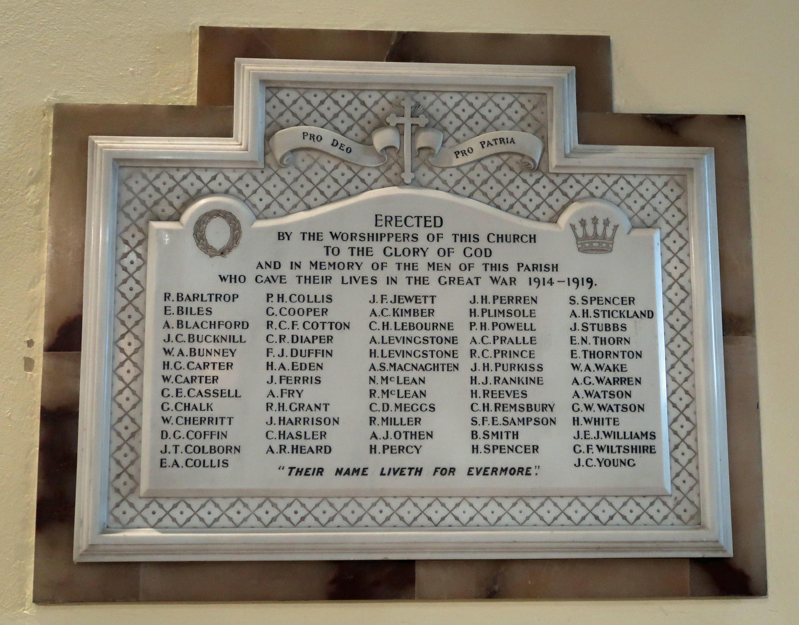 Erected by the worshippers of this Church to the Glory of God and in memory of the men of this parish who gave their lives in the Great War, 1914-1919. Includes: J Harrison