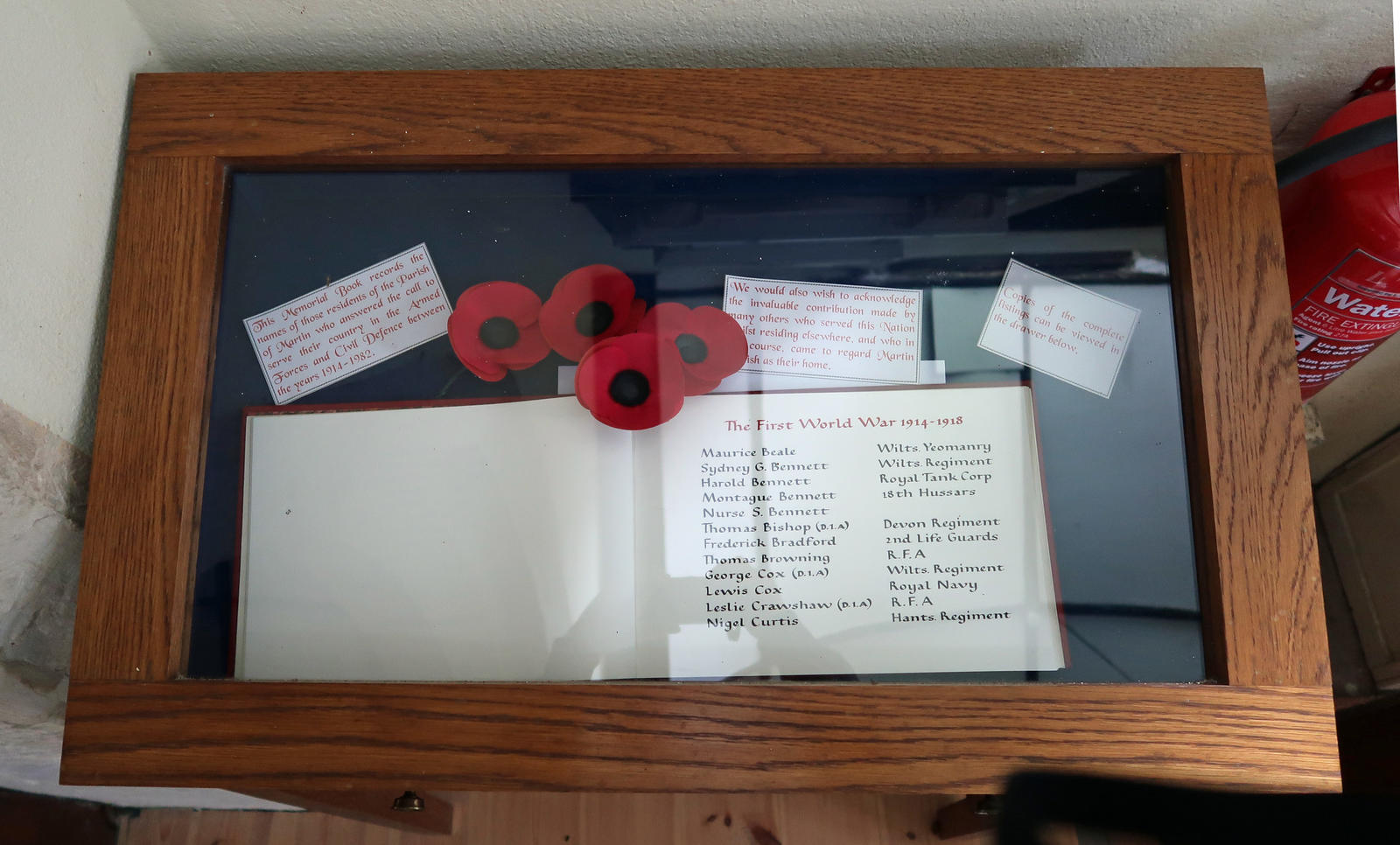 Hand-written book kept in glass-topped desk with typed contents in drawer beneath. Includes those who 'served'. WW1: Probably: Fred Martin, RMLI, PO/7118; Robert Martin, RMLI, PO/7206. WW2: Norman Harris, RM
