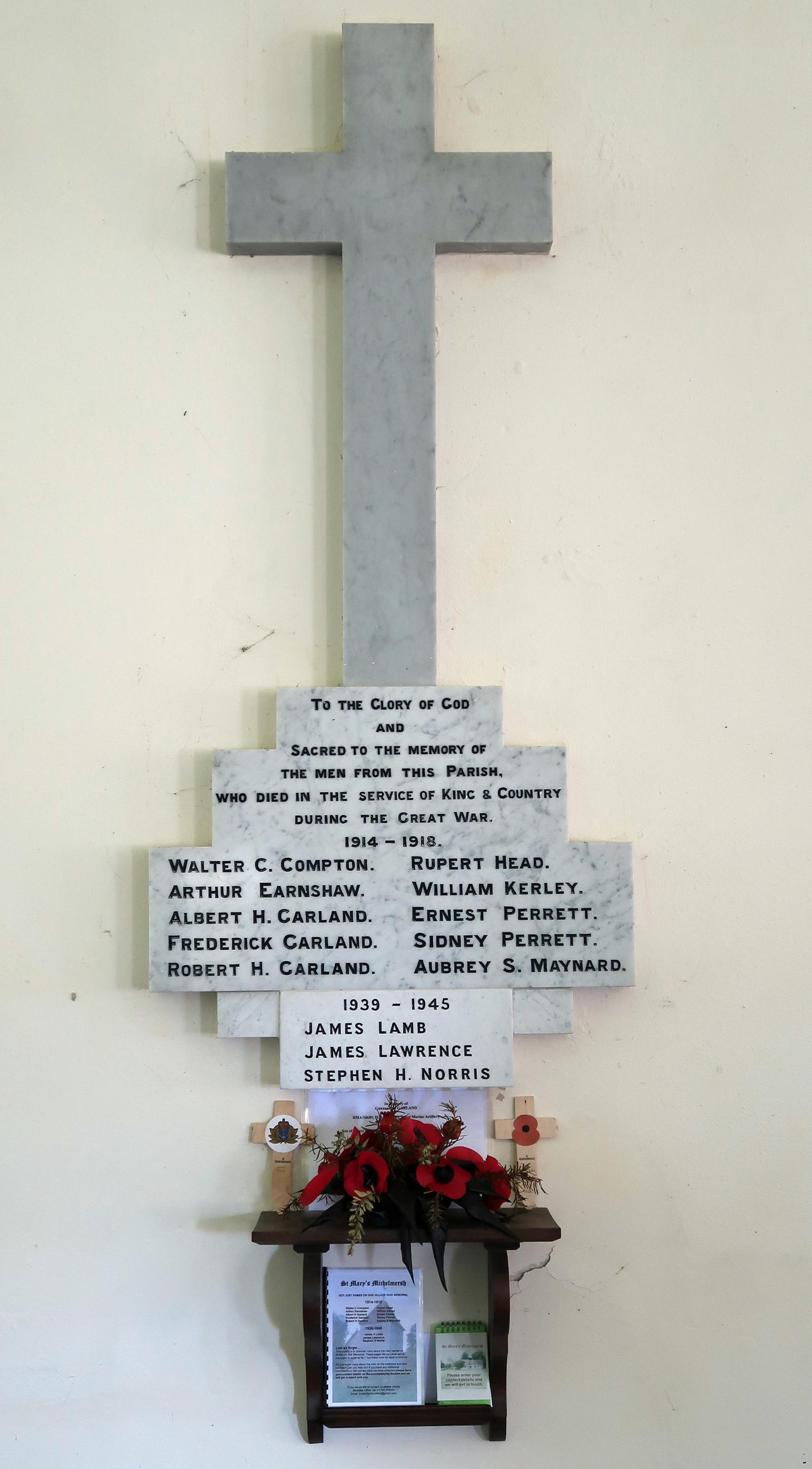 To the Glory of God and sacred to the memory of the men from this Parish who died in the service of King & Country during the Great War, 1914-1918. Includes: Robert H Garland.