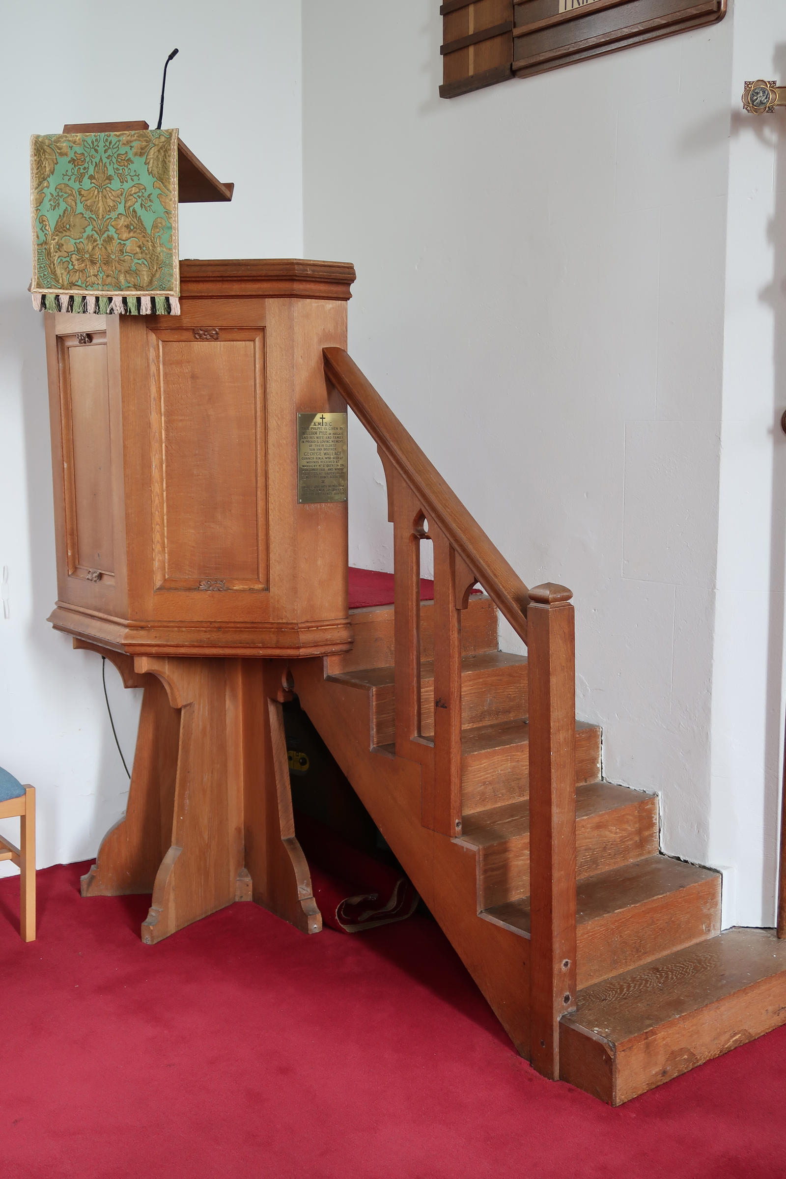 AM+DG, This pulpit is given by William Pyle of Hoegate and his wife and family in proud and loving memory of their eldest son and brother George Wallace gunner RMA who died of wounds received at Wassigny nr St Quentin on 12 October 1918 and whose body lies at Vadencourt Cemetery, France, aged 23 years. Greater love hath no man than this, that a man lay down his life for his friends, John 15.13