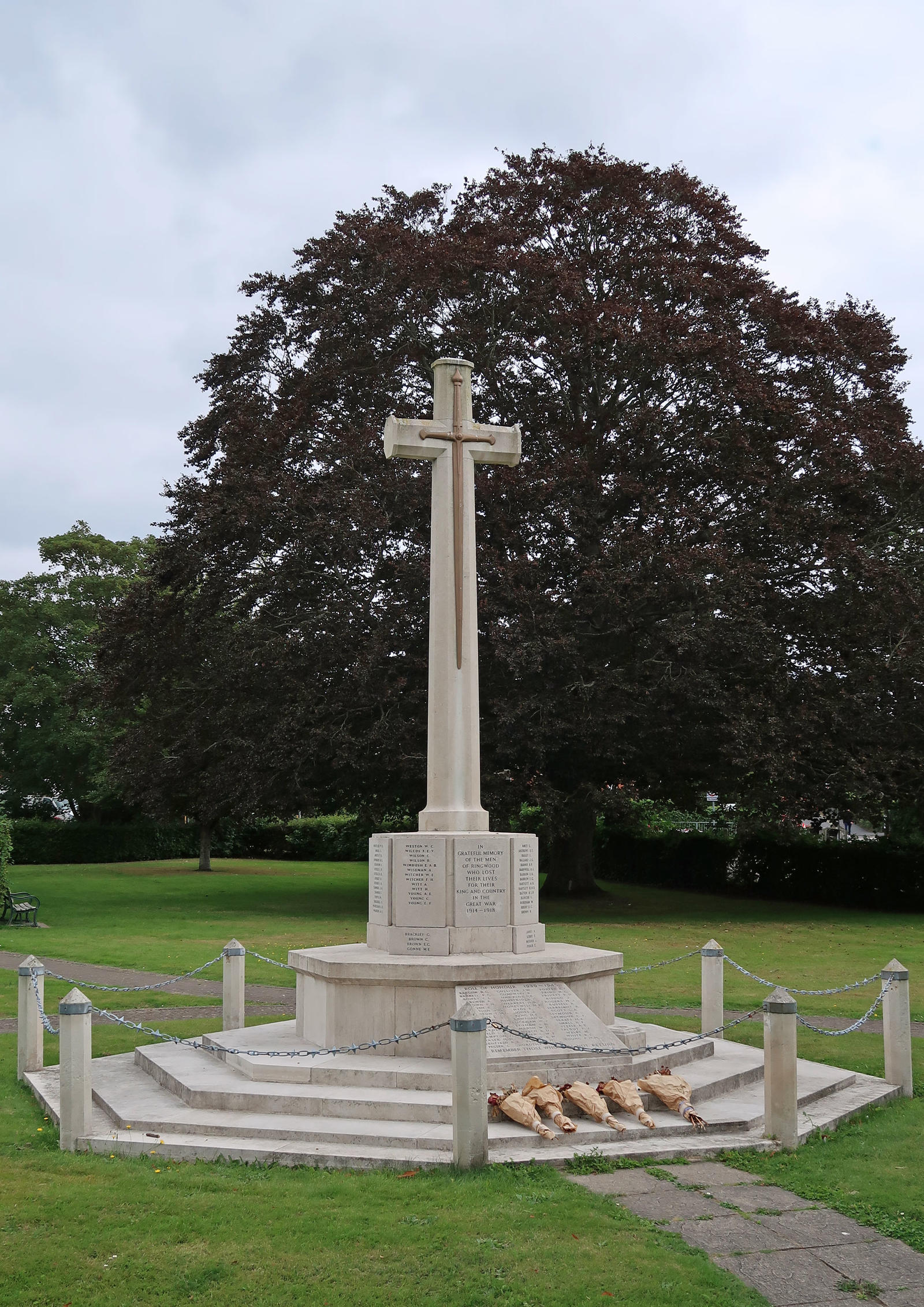 WW1: In grateful memory of the men of Ringwood who lost their lives for their King and Country in the Great War, 1914-1918. Includes: Mew, J; Perrett, R F F; Saint, E G; Smith, T H; Wilcox, F E V. WW2: Roll of Honour, 1939-1945. Includes: Skeats, H E.