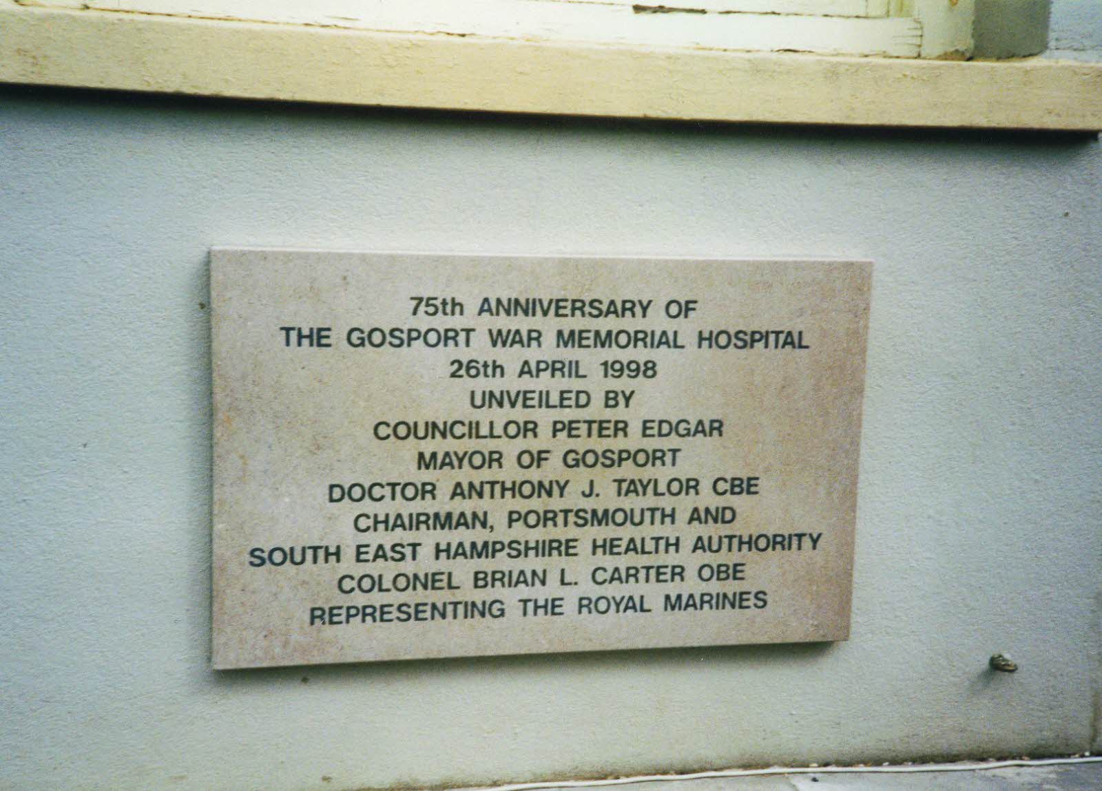 75th Anniversary of the Gosport War Memorial Hospital 26th April 1998 Unveiled by Councillor Peter Edgar Mayor of Gosport, Doctor Anthony J Taylor CBE, Chairman, Portsmouth and South East Hampshire Health Authority, Colonel Brian L Carter OBE representing the Royal Marines