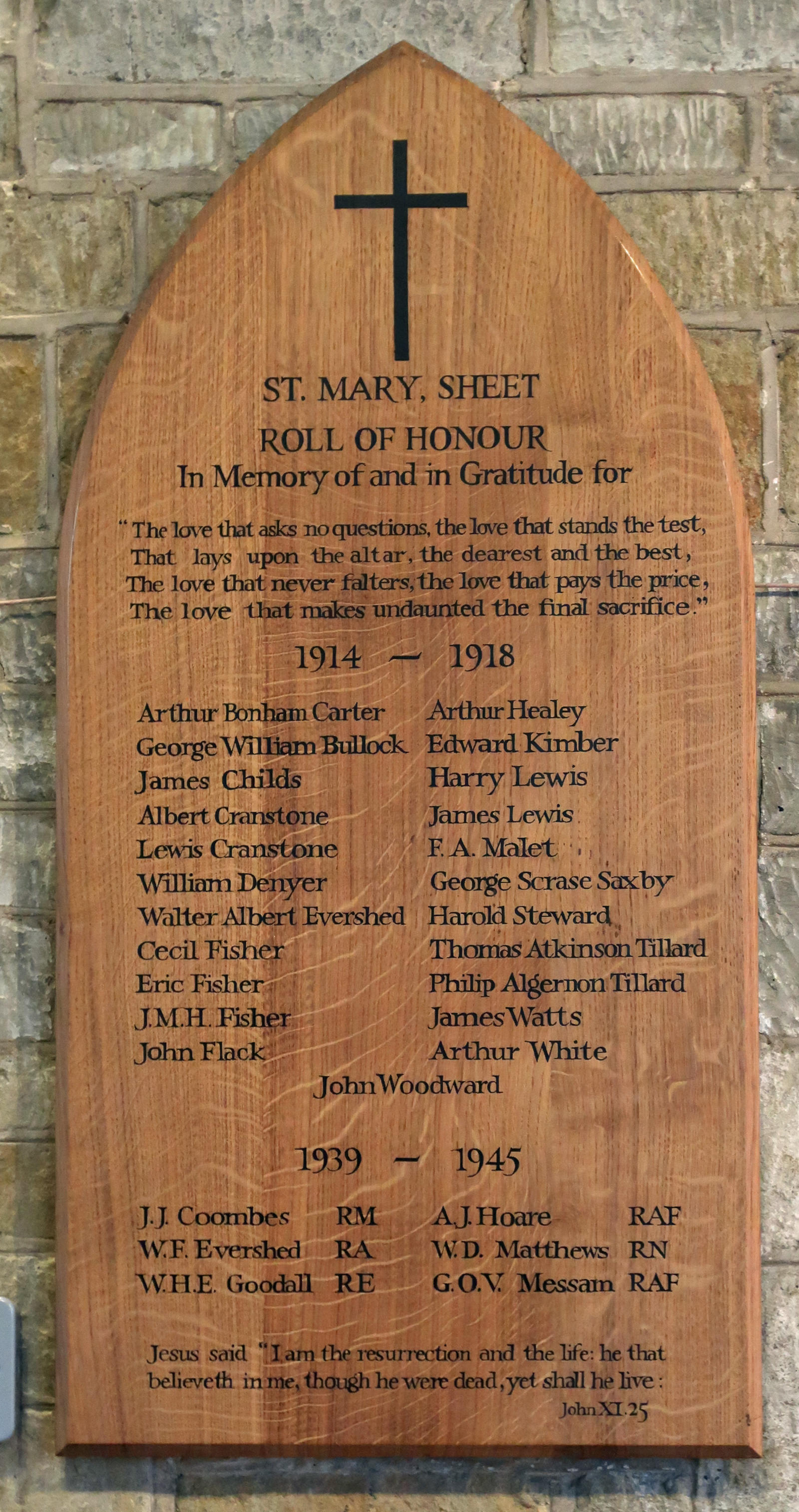St Mary, Sheet, Roll of Honour, In memory of and in gratitude for "The love that asks no questions, the love that stands the test, That lays upon the altar, the dearest and the best, The love that never falters, the love that pays the price, The love that makes undaunted the final sacrifice." 1914-1918, 1939-1945. Includes: WW1: George William Bullock. WW2: J J Coombes, RM